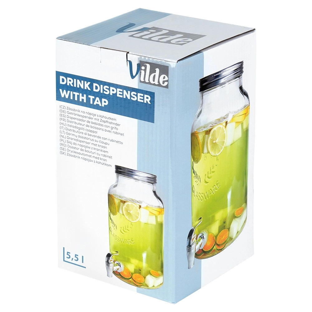 El dispensador de vidrio de gran capacidad con grifo es una opción perfecta para servir bebidas refrescantes en fiestas al aire libre, celebraciones familiares e incluso en hostelería. Gracias a su volumen de 6,2 l, podrás preparar cómodamente agua con fruta, limonada casera o té helado y servirlos con estilo directamente en la mesa.