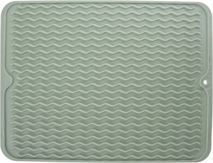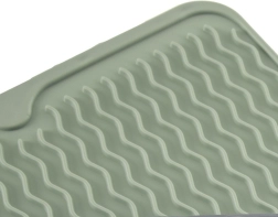 Esta alfombrilla escurreplatos de silicona es una alternativa estilosa y que ahorra espacio frente a los escurreplatos tradicionales. Las ranuras altas y onduladas garantizan una evacuación eficiente del agua en una sola dirección y mejor circulación del aire, de modo que la vajilla se seca más rápido y sin charcos. Su diseño minimalista en un suave tono verde encaja en cualquier cocina.