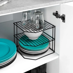 La solución de tres niveles con ángulo esquinero de 90° convierte un rincón vacío del armario en un almacenamiento ordenado para platos, cuencos y tazas.