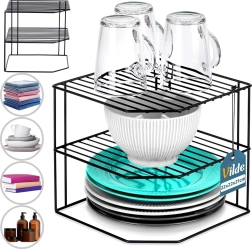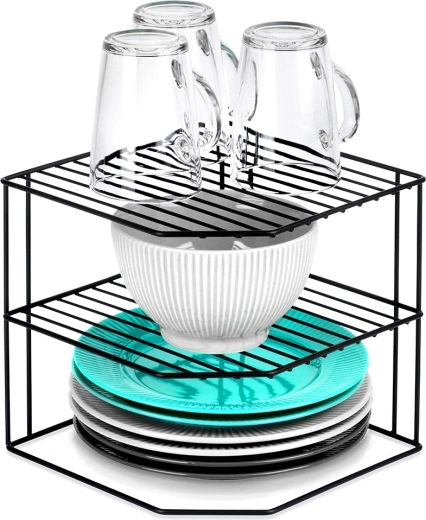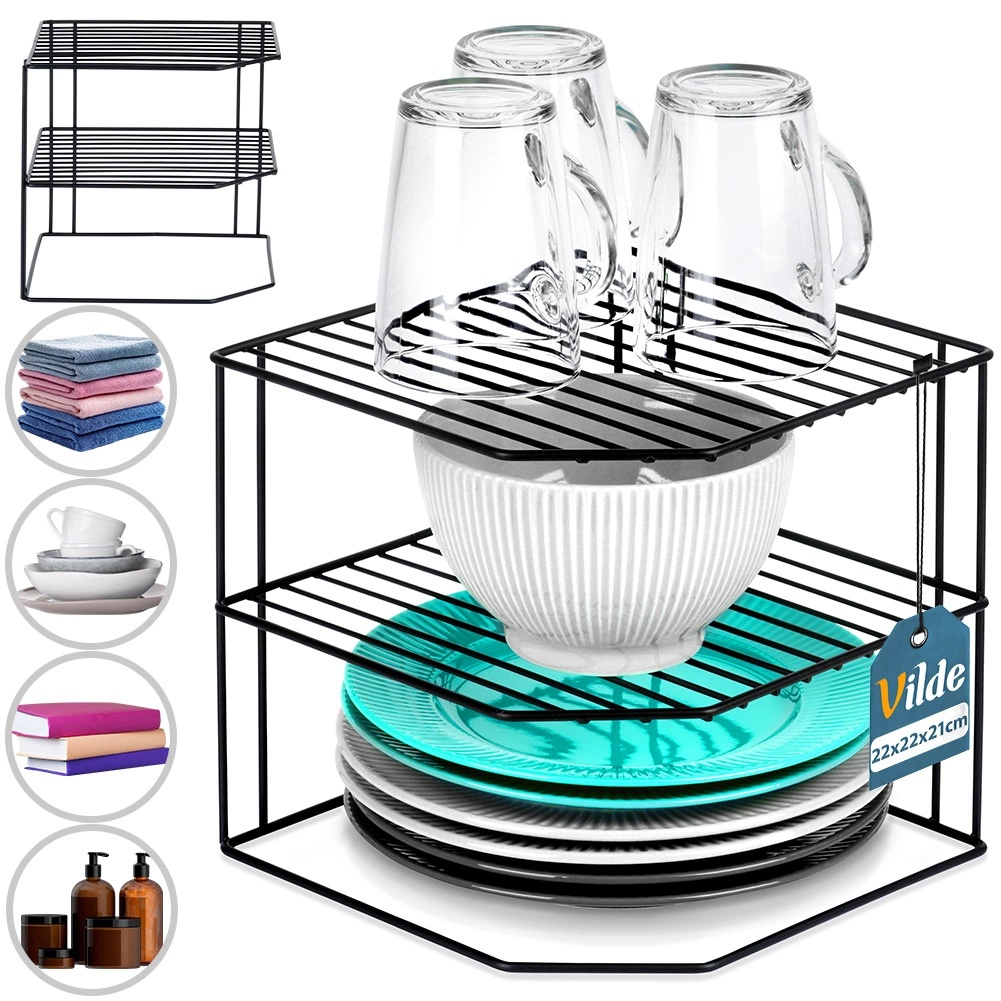 Esta estantería esquinera de cocina con dimensiones de 22 × 22 × 21 cm divide eficazmente el espacio del armario en tres niveles, por lo que podrás organizar mejor platos, cuencos, vasos y alimentos. Su estructura de alambre abierto garantiza ventilación y visibilidad, mientras que el recubrimiento en polvo en negro aporta un aspecto elegante y resistencia a la abrasión.
