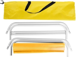 La tumbona se pliega en un instante y se guarda en la bolsa incluida con correa. El tamaño compacto de 60 × 18 × 8 cm cabe en el maletero o en el armario.