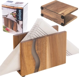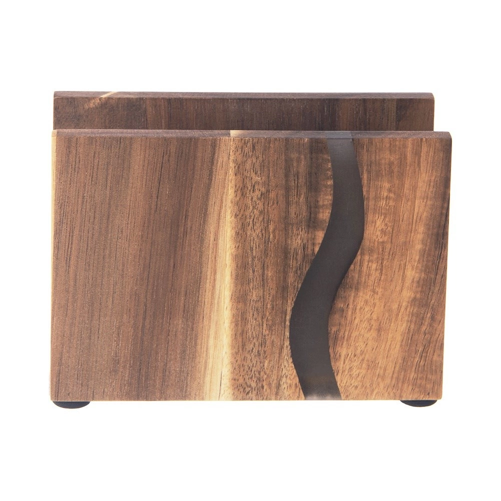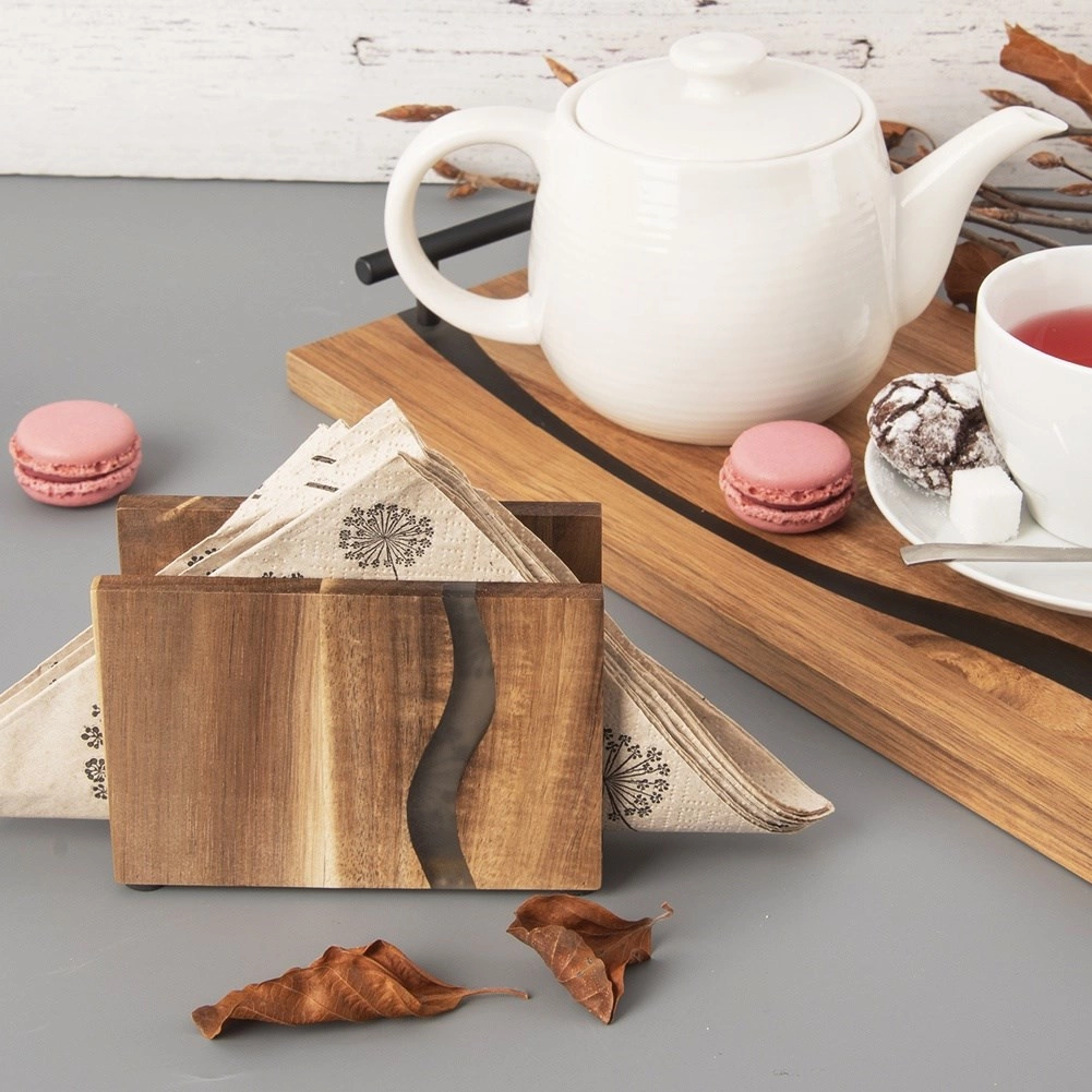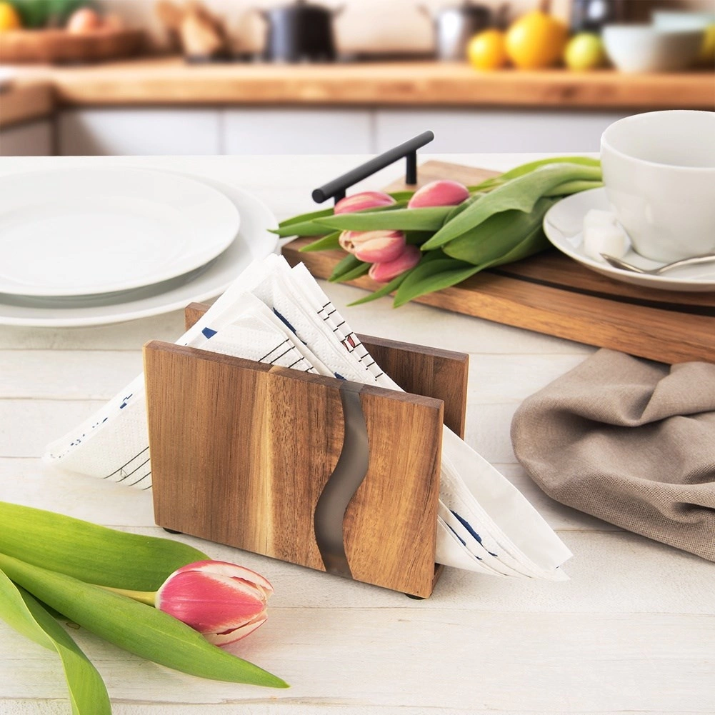Aporta orden y estilo a tu mesa. El soporte de servilletas River está fabricado en madera de acacia natural con resina epoxi incrustada, que evoca el fluir de un río. Combina funcionalidad y un moderno aspecto natural, convirtiéndose en un accesorio llamativo para la cocina, el comedor o una cafetería.
