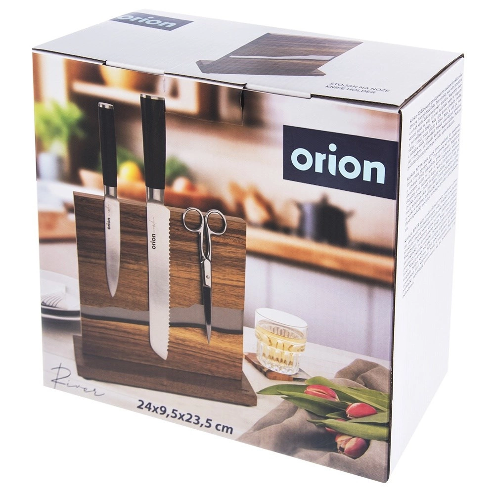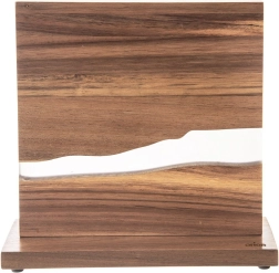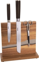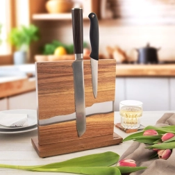 El soporte River combina la belleza natural de la madera de acacia con una incrustación de resina original que recuerda al cauce de un río. La superficie magnética en ambos lados permite fijar cuchillos y utensilios de cocina metálicos sin introducirlos en ranuras: tendrá el filo siempre a la vista y a mano. La base estable con patas de fieltro permanece firme en su lugar y además protege la encimera.