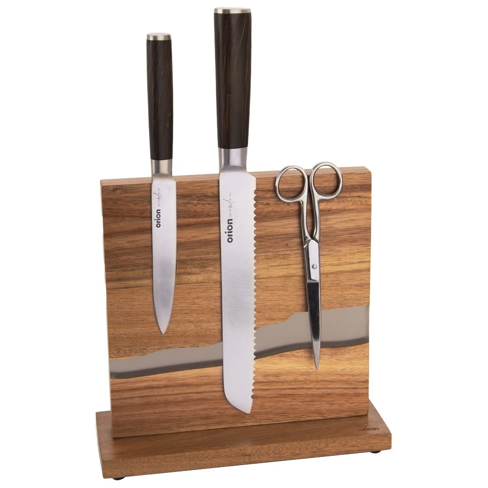 Elegante soporte para cuchillos de doble cara de madera natural de acacia con resina decorativa estilo “río”, que ofrece una superficie magnética potente, almacenamiento seguro y ordenado para cuchillos y tijeras, y un diseño moderno apto para cualquier cocina. Gracias al almacenamiento a doble cara ahorra espacio en la encimera y las almohadillas de fieltro en la base protegen la superficie de trabajo de los arañazos.