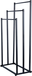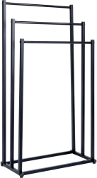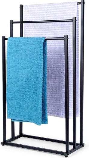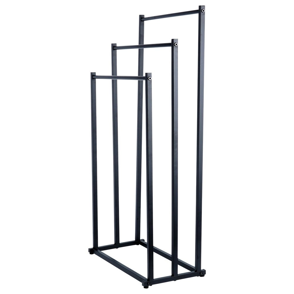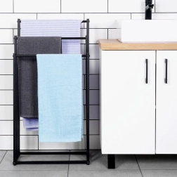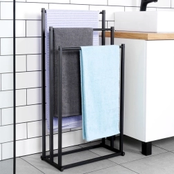 Práctico toallero o perchero de pie con tres barras dispuestas en escalón que garantiza un almacenamiento ordenado y mejor circulación del aire para un secado más rápido. Su diseño minimalista en negro mate combina a la perfección con interiores modernos y aporta un toque industrial al baño.