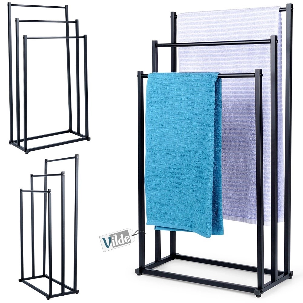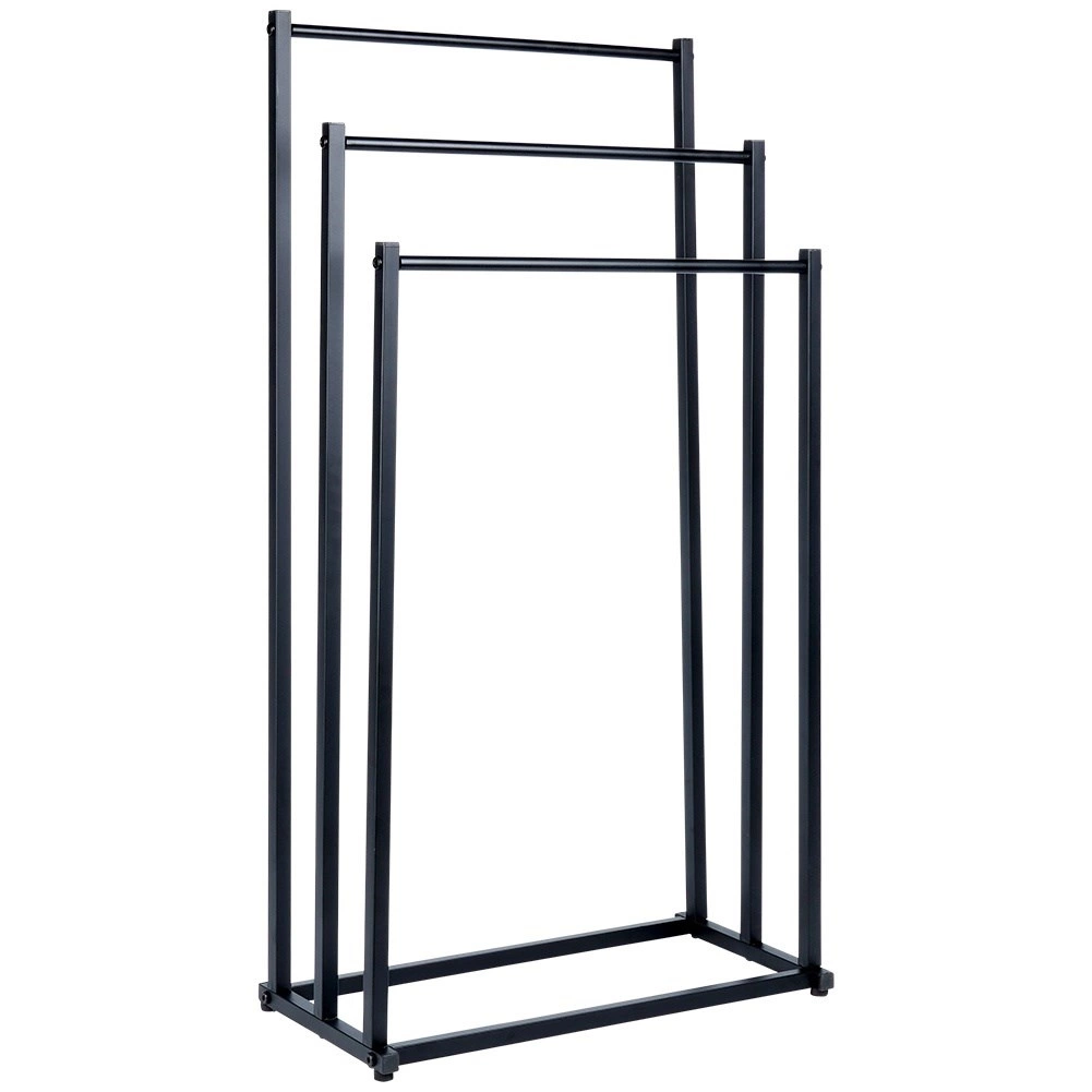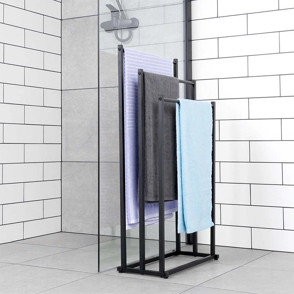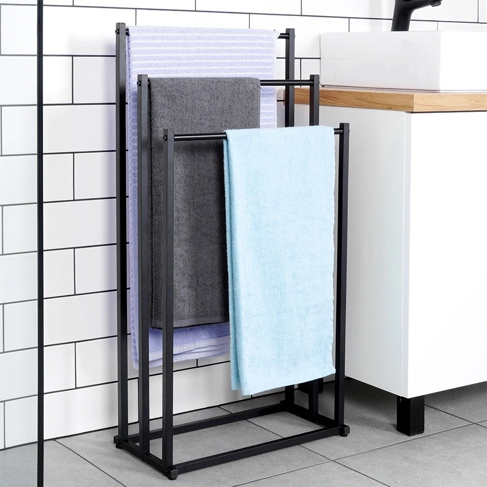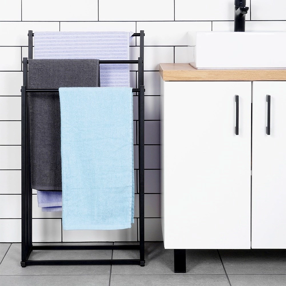 Elegante toallero de pie con tres barras escalonadas que ofrece secado rápido, ahorro de espacio y una estructura metálica estable con recubrimiento en polvo de color negro. Ideal para baños modernos y clásicos, de fácil montaje y con estilo loft.