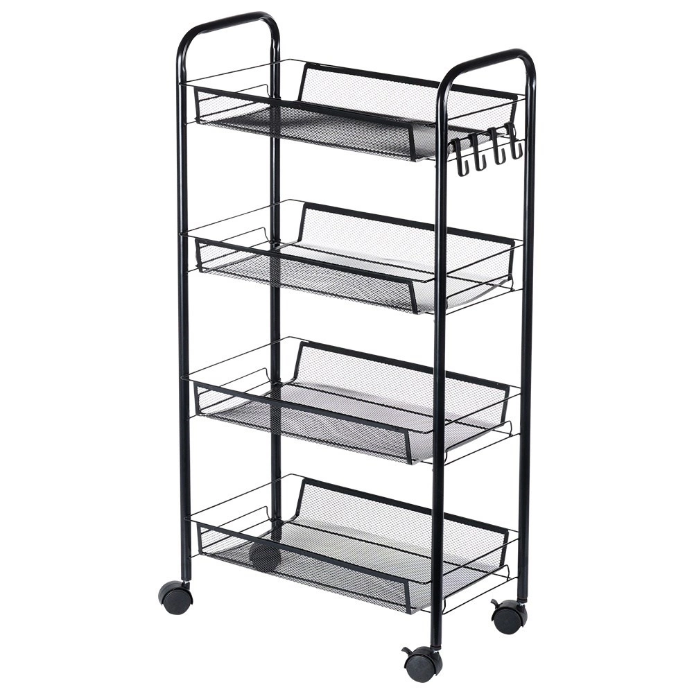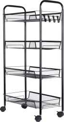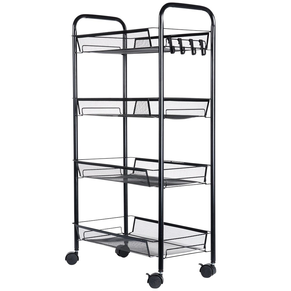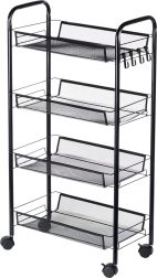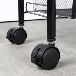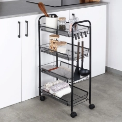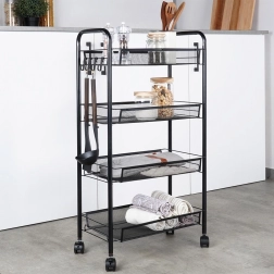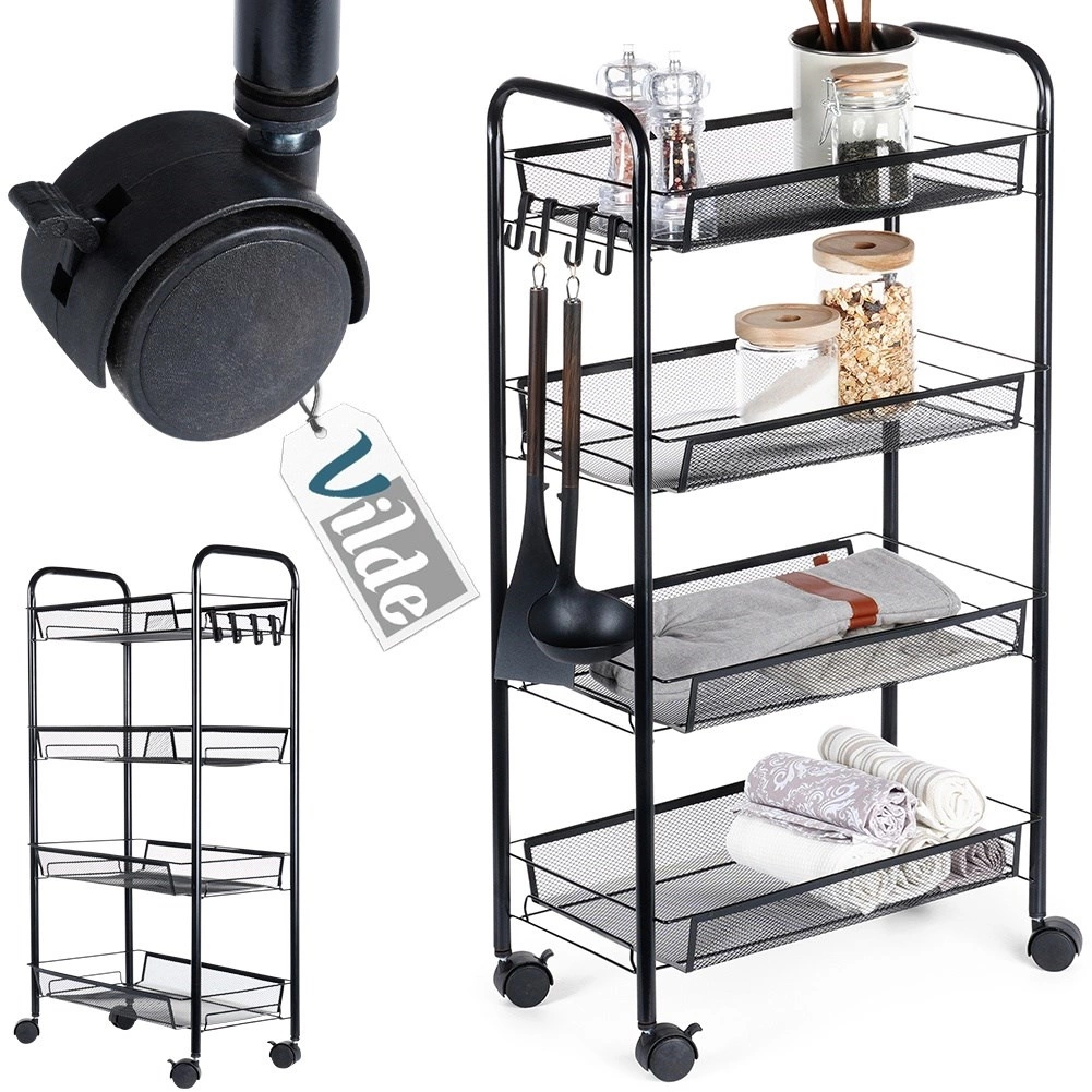 La estructura resistente y estable de metal pintado en negro está diseñada para una larga durabilidad y un mantenimiento sencillo. Los ganchos laterales ofrecen espacio para paños, utensilios de cocina o cepillos. La estantería es ideal para la cocina, el baño, la oficina, el taller e incluso un balcón o terraza cubiertos.