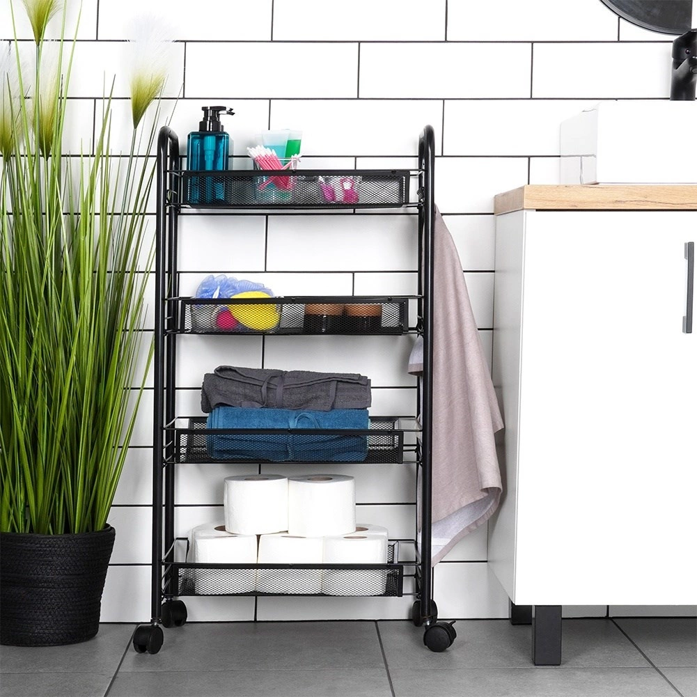 Un ayudante estrecho y compacto para el orden diario. La estantería metálica con 4 cestas aprovecha eficazmente el espacio vertical, por lo que incluso en áreas pequeñas podrás guardar alimentos, cosméticos, productos de limpieza, toallas o material de oficina. Gracias a las ruedas giratorias se traslada fácilmente donde se necesite y los dos frenos garantizan una posición estable.