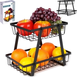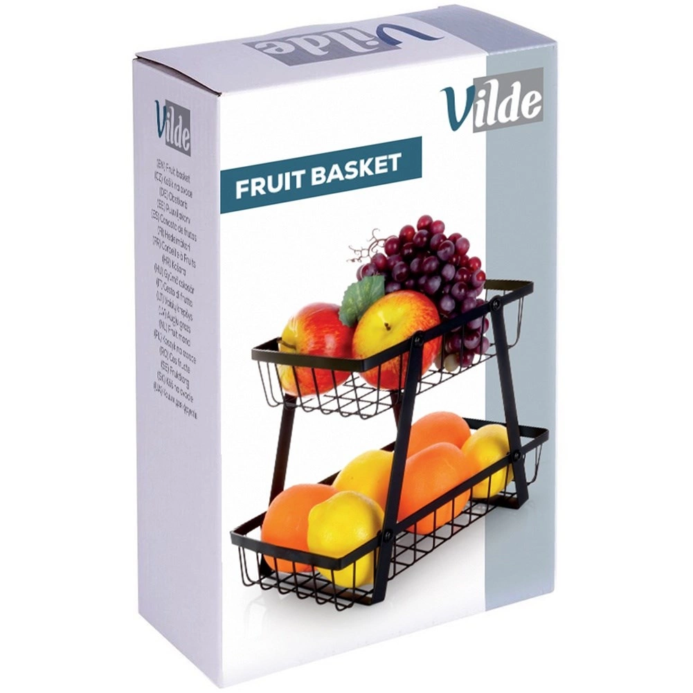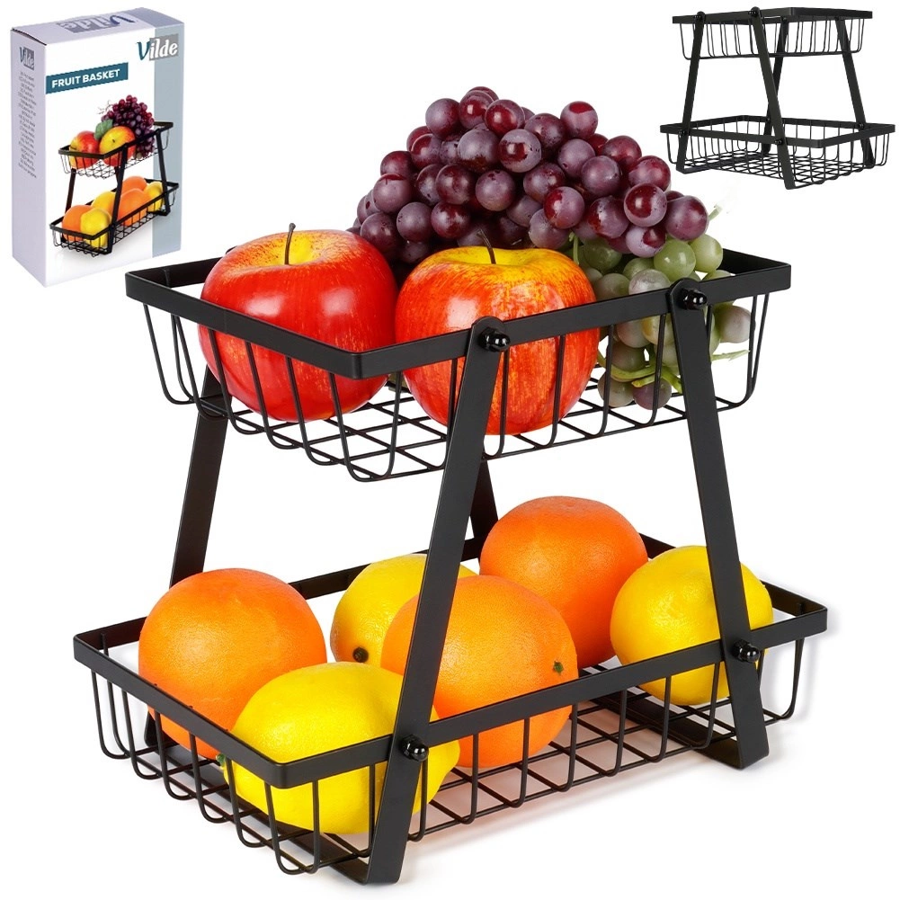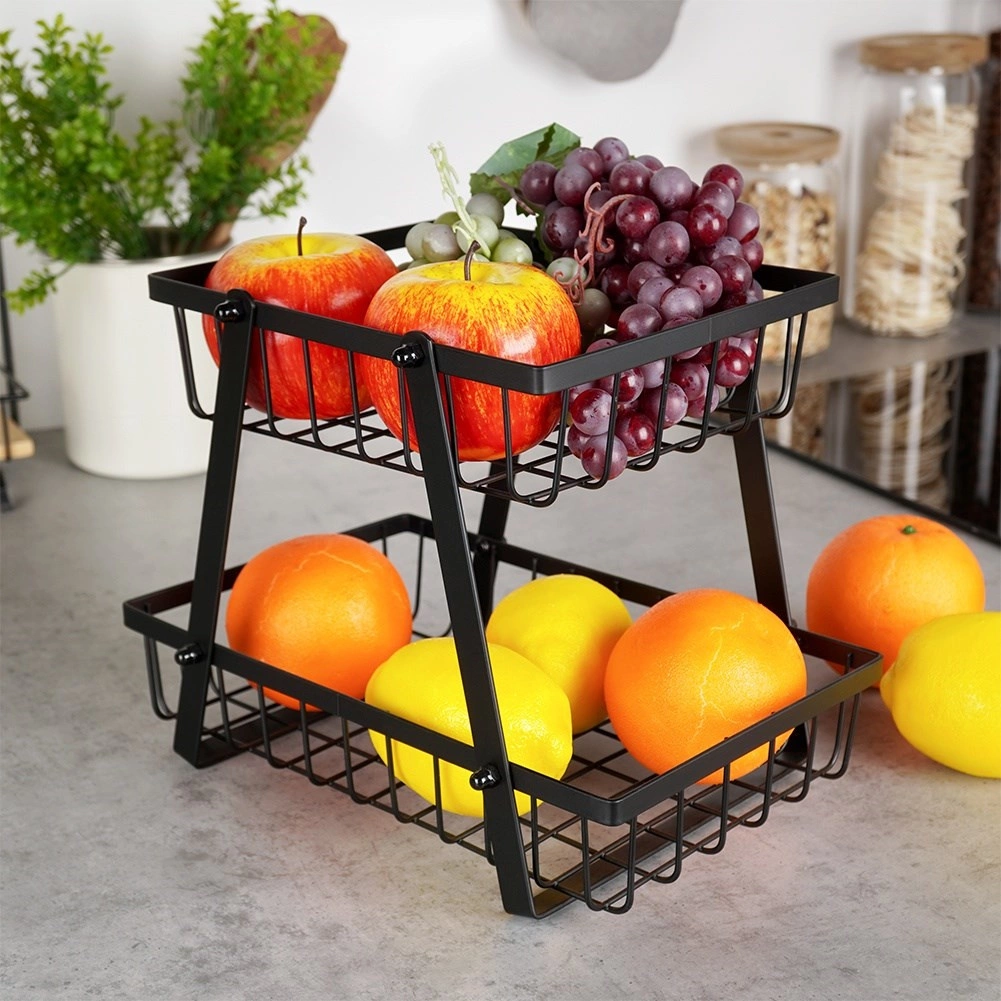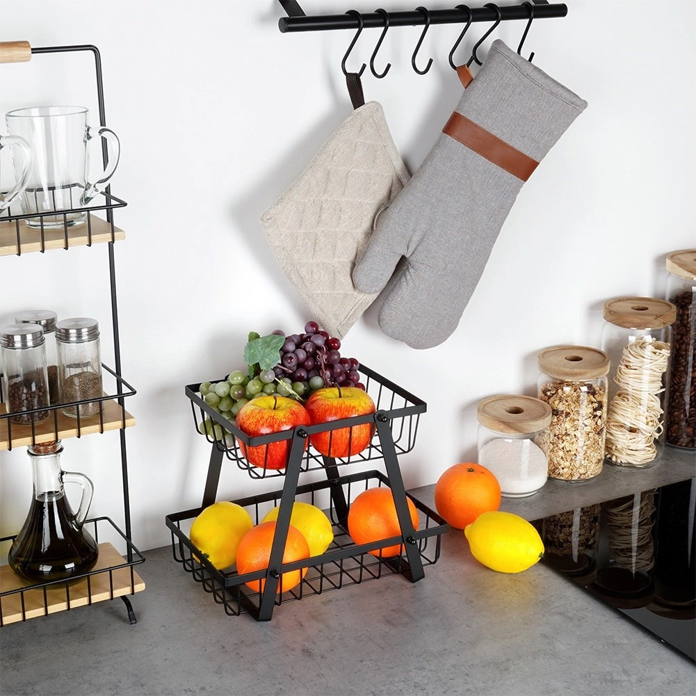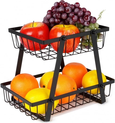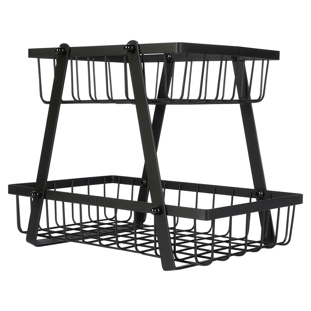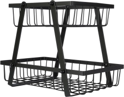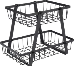 Un ayudante práctico y con estilo para cualquier cocina: el soporte de dos niveles con cestas de alambre de estilo loft industrial ahorra espacio y, al mismo tiempo, exhibe tus frutas y verduras. Los laterales abiertos favorecen la circulación del aire, por lo que los alimentos se mantienen frescos durante más tiempo y a la vista.
