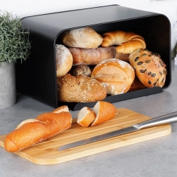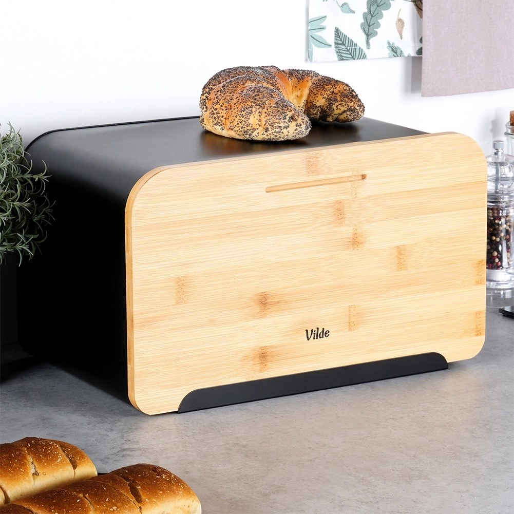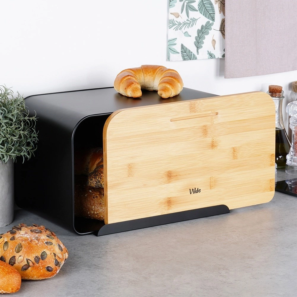 La moderna panera que combina metal negro mate y bambú natural limita eficazmente la entrada de aire, de modo que el pan y la bollería se mantienen más tiempo tiernos y sabrosos. El cuerpo de metal macizo es resistente y evita el daño mecánico del pan, mientras que la tapa natural aporta calidez y elegancia a la cocina.