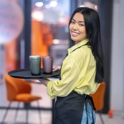 Fabricada en plástico de alta calidad y ligero, se limpia fácilmente y soporta el uso diario. La bandeja ofrece espacio suficiente para transportar varios pedidos a la vez y aporta un aspecto elegante y profesional.