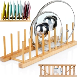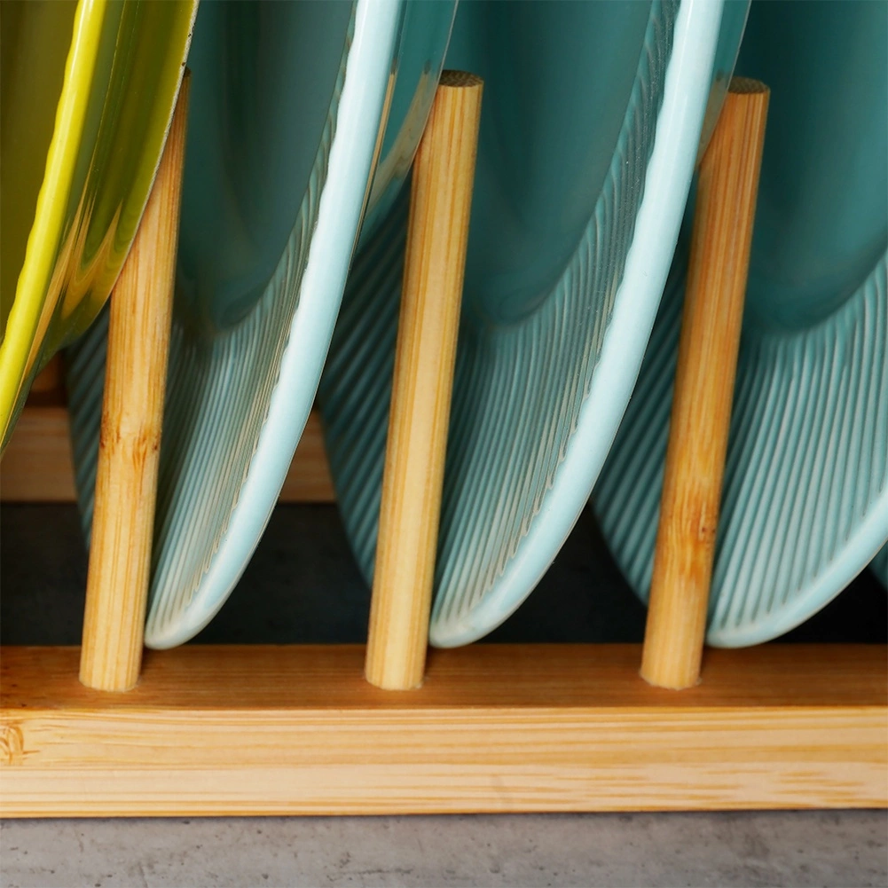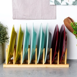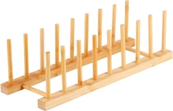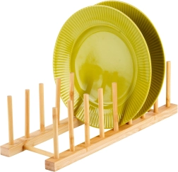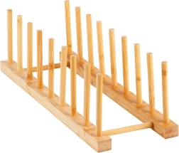 Este soporte universal de bambú natural ayuda a mantener el orden en la encimera, en el cajón y en el armario de la cocina. Gracias al espaciamiento pensado de las varillas, separa de forma segura tapas, platos llanos y hondos (según su perfil) y tablas de cortar. El material natural con superficie lisa protege la vajilla de arañazos y a la vez permite una buena circulación del aire.