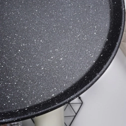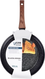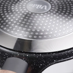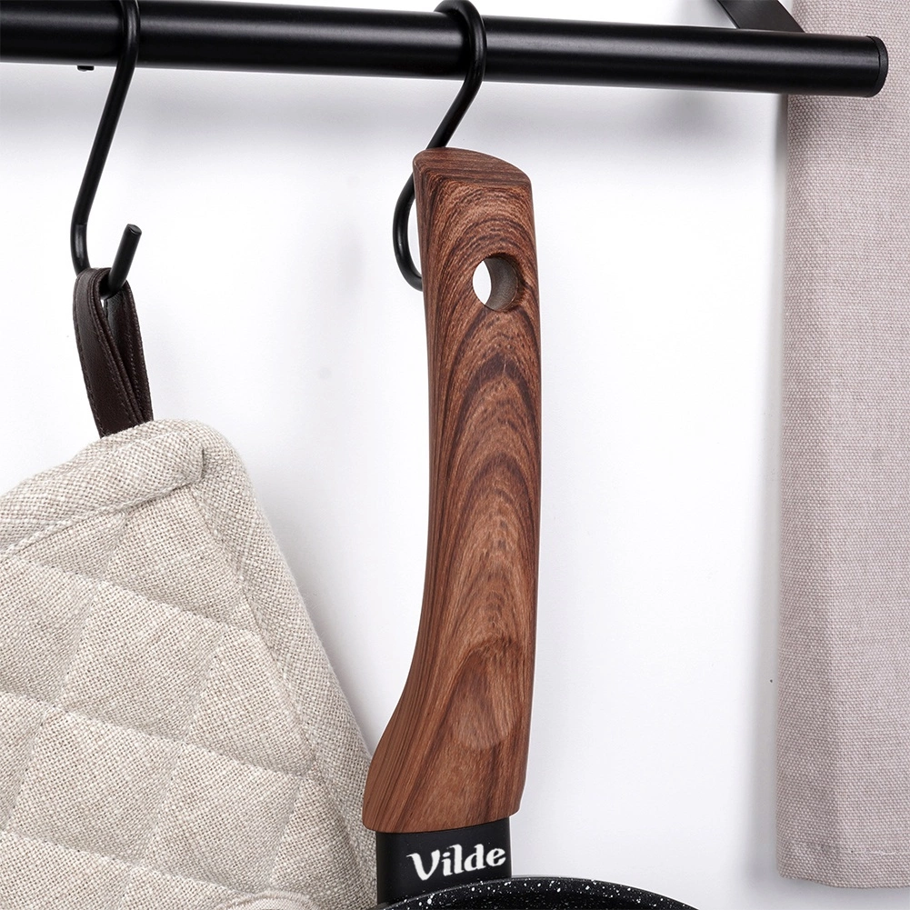 El cuerpo de aluminio con fondo multicapa garantiza un calentamiento rápido y uniforme, ahorrando tiempo y energía. El mango ergonómico y antideslizante con aspecto de madera es agradable al tacto y tiene un orificio para colgar en una barra. La sartén es fácil de mantener y apta para lavavajillas.
