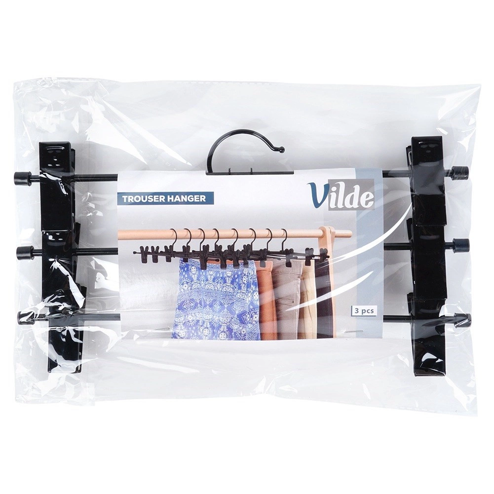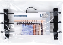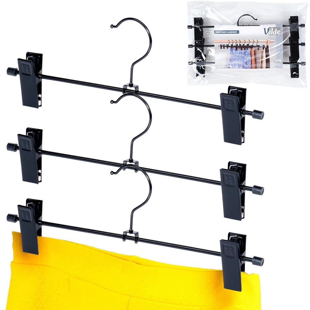 Práctico juego de tres perchas metálicas con pinzas ajustables para pantalones y faldas. Gracias a su sólida construcción y a los soportes deslizantes, mantienen la ropa segura en su sitio, ahorran espacio en el armario y ayudan a prevenir arrugas. Metal resistente, pinzas con muelle fuerte con inserciones protectoras y uso universal para distintos tipos de prendas.