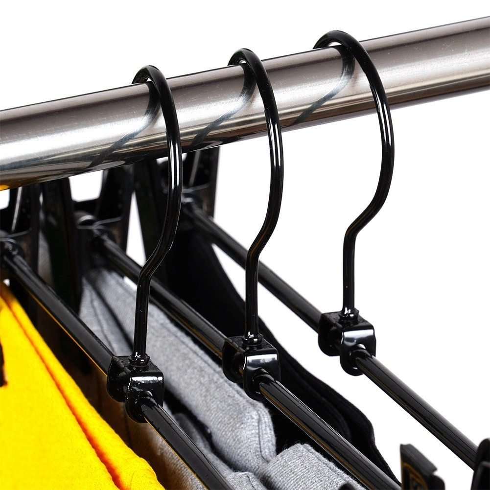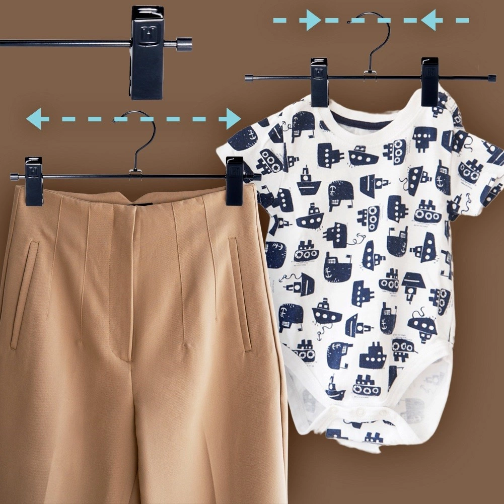 Cada percha ofrece pinzas deslizantes para adaptar el ancho a diferentes tallas: desde ropa infantil hasta pantalones, faldas o shorts de mujer y hombre. Ahorro de espacio y protección contra arrugas garantizan un aspecto impecable de tus prendas.