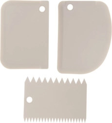 Con este juego de tres espátulas conseguirás laterales perfectamente lisos y texturas originales en tartas, brazos de gitano y pasteles. Los bordes dentados crean efectos de ondas, rayas o líneas, mientras que las espátulas lisas aseguran una distribución uniforme de cremas y glaseados. Gracias a su construcción ligera y robusta, las herramientas se manejan muy bien y el trabajo es rápido y preciso.