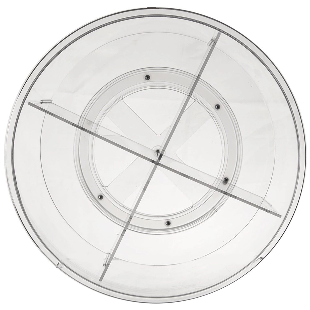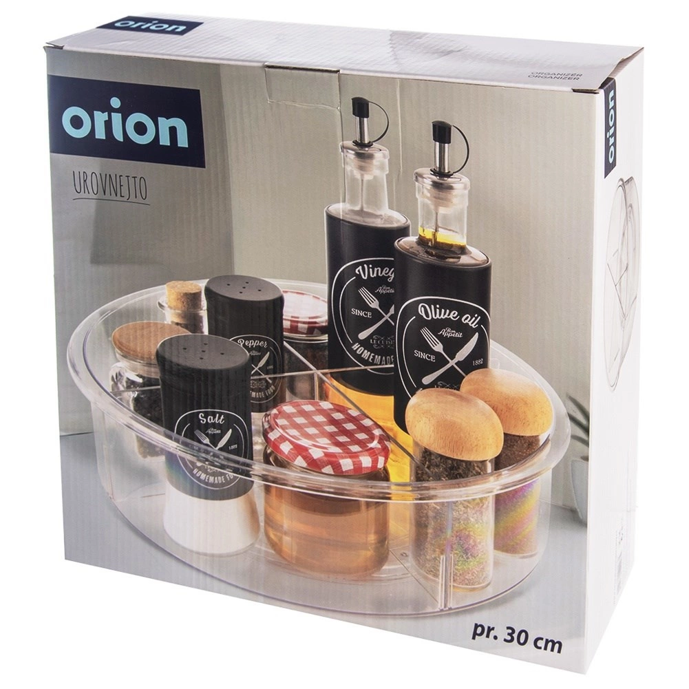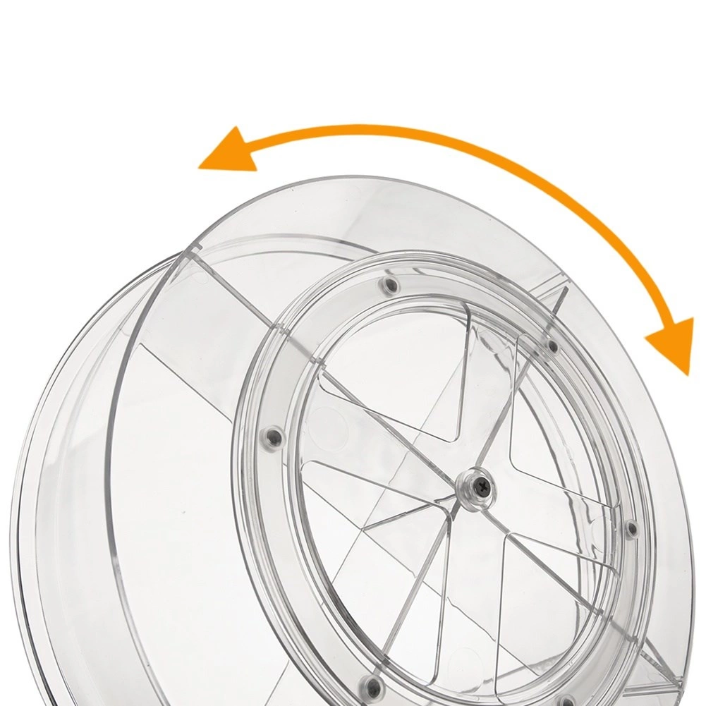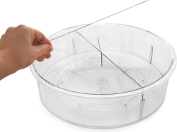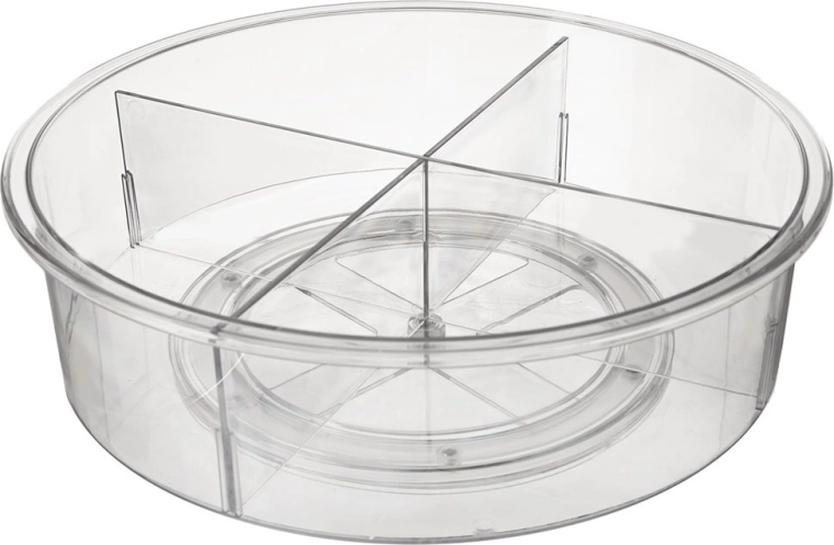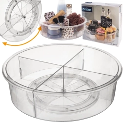 Práctico organizador giratorio con un diámetro de 30 cm y una altura de 9 cm que aporta orden a la cocina, el baño y la despensa. Gracias a la base de giro suave, rota 360°, para tenerlo todo rápidamente a mano. El diseño transparente y las 4 secciones separadas facilitan la clasificación clara de especias, cosméticos, botellas y tarros, mientras que los bordes elevados evitan que se caiga el contenido al girar.