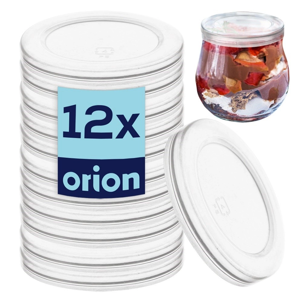Práctico juego de 12 tapas de plástico transparentes con un diámetro de 5,5 cm para vasitos de yogur y postre de 130 ml. Las tapas garantizan un cierre hermético, mantienen la frescura y protegen el contenido durante el almacenamiento y el transporte. Fabricadas con material resistente para uso repetido. Calidad comprobada de la marca ORION.
