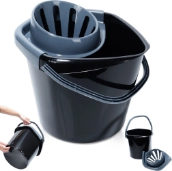 Práctico cubo de plástico con capacidad de 14 l y escurridor extraíble para mopas de tiras y de cordones. Ofrece una estructura robusta, asa cómoda para un transporte seguro y pico vertedor moldeado para verter de forma limpia y precisa sin derrames. El ayudante ideal para la limpieza del hogar, taller y jardín.