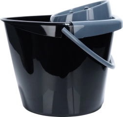 Cubo universal con una construcción de plástico resistente en color negro y escurridor gris que combina bajo peso con alta durabilidad. Gracias al asa ergonómica se transporta cómodamente incluso completamente lleno, y el pico vertedor moldeado garantiza un vertido controlado sin desorden.