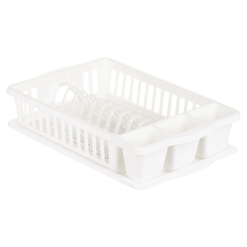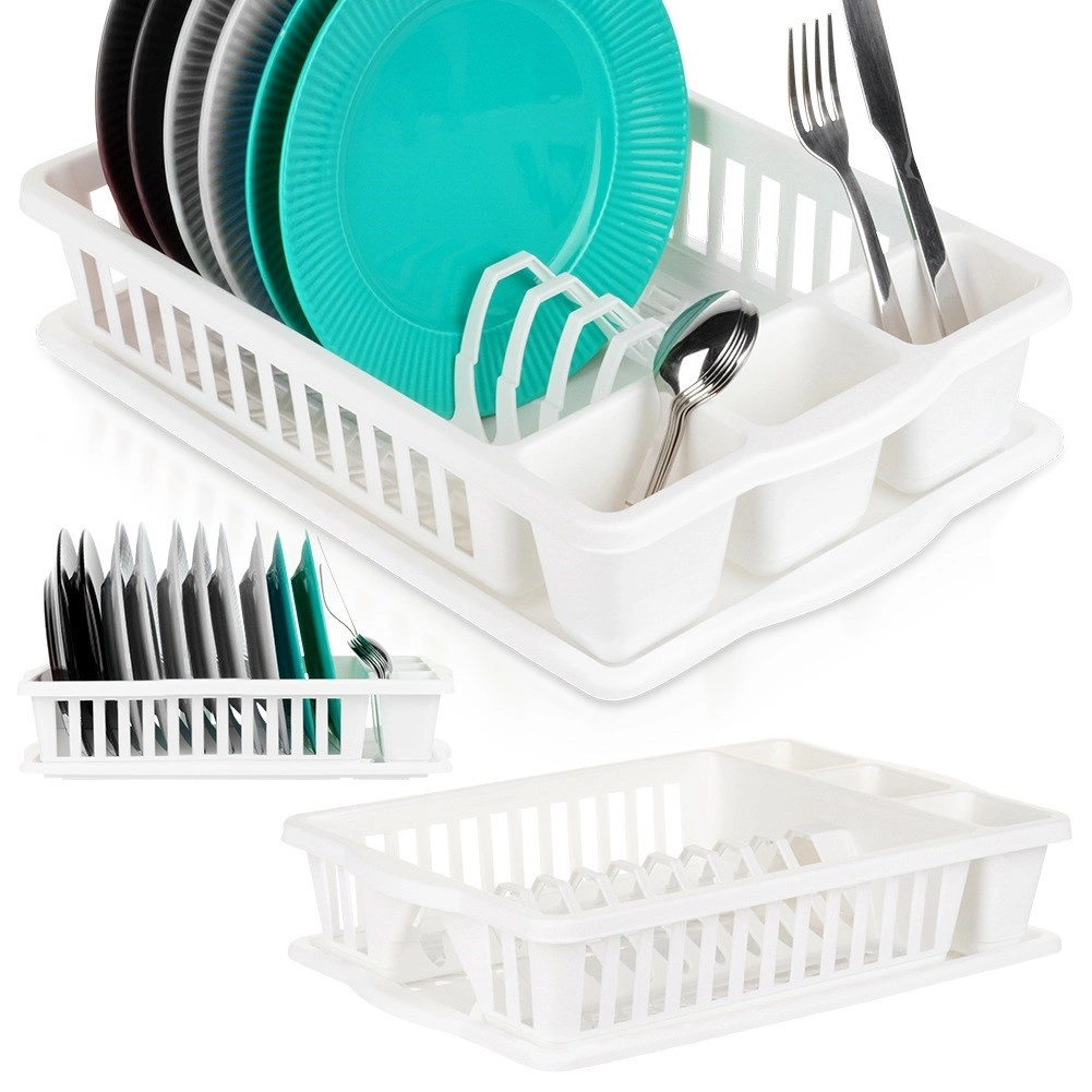Práctico escurreplatos blanco de 39,5 × 26 × 8,5 cm para secar de forma ordenada platos, vasos y cubiertos. Ofrece gran capacidad, bandeja de goteo extraíble y resistente diseño de plástico, que protege la encimera del agua y facilita el mantenimiento.