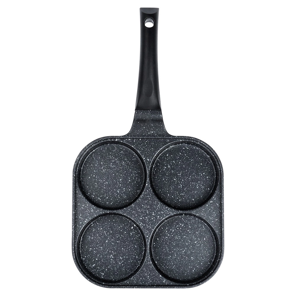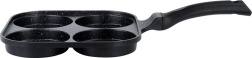 La sartén cuadrada de 22 × 22 cm con cuatro cavidades independientes garantiza un tamaño de porción uniforme y un aspecto perfecto para el desayuno. El cuerpo de aluminio con capa antiadherente de granito se calienta rápidamente y distribuye el calor de forma excelente, para freír rápido, eficiente y sin que se pegue. El mango ergonómico y antideslizante con orificio para colgar garantiza un uso cómodo y seguro.