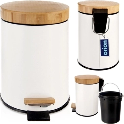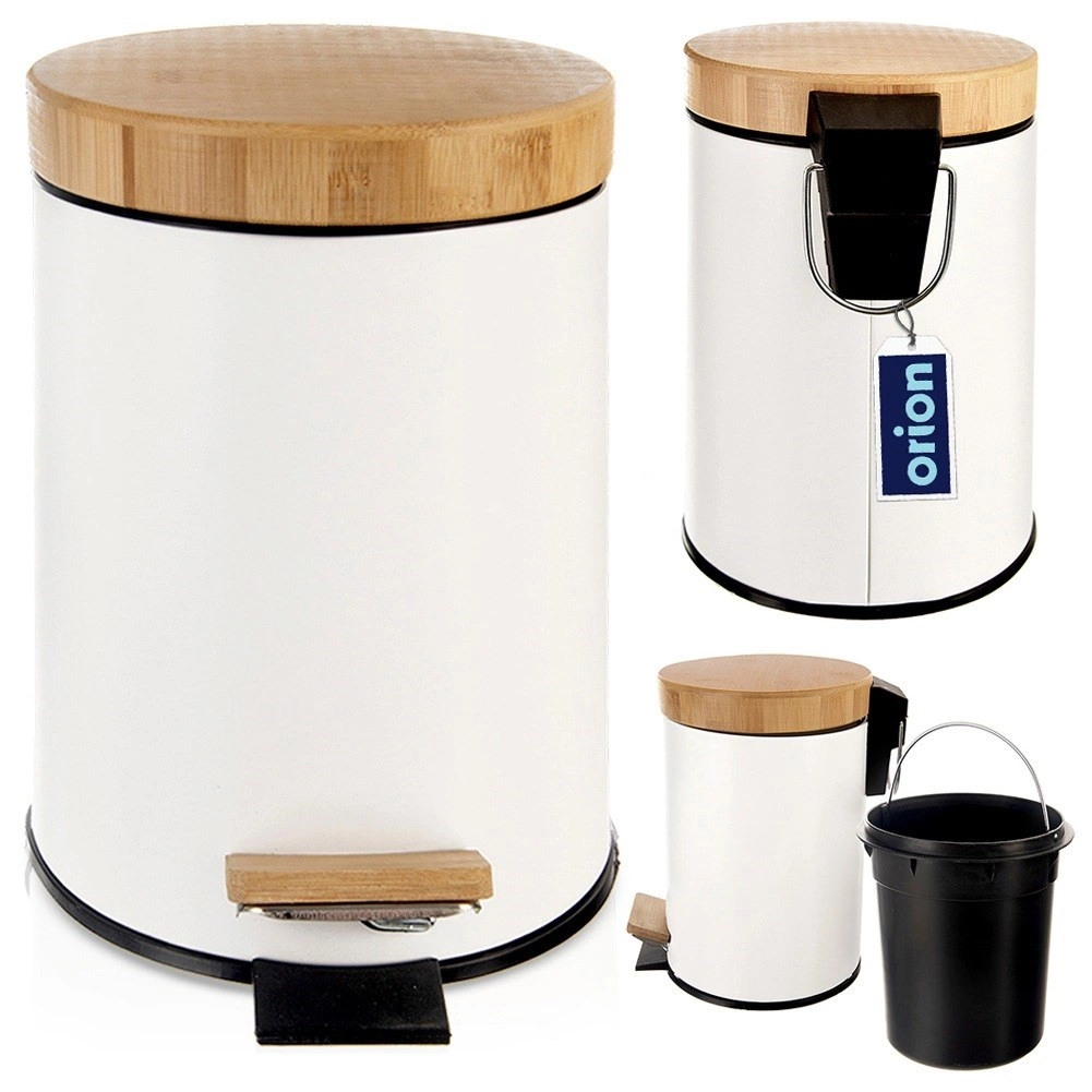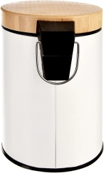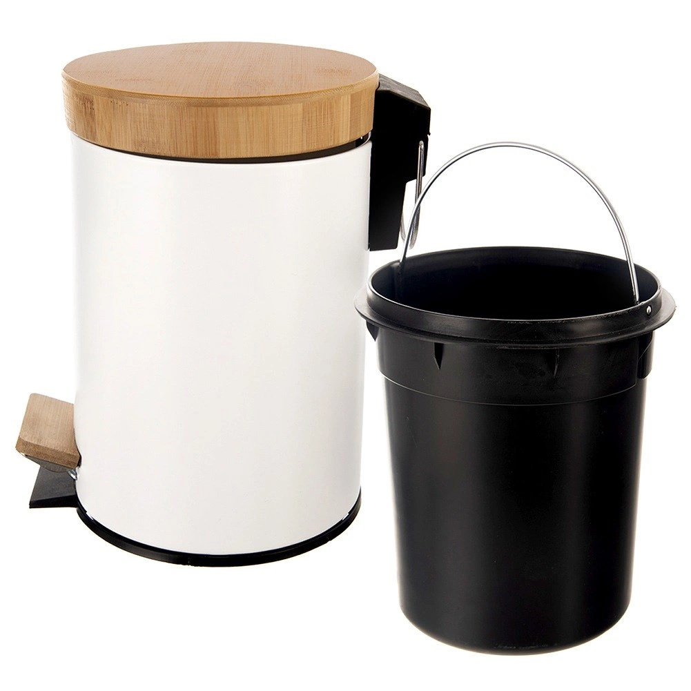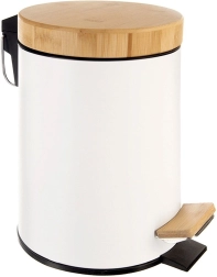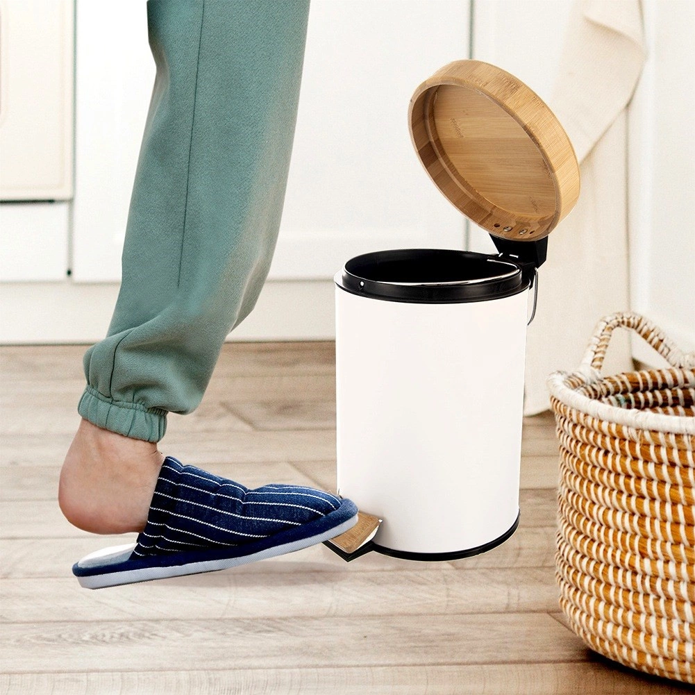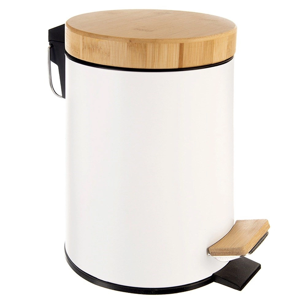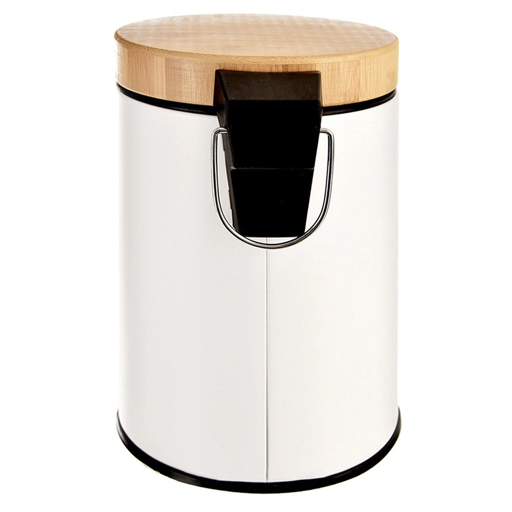 Cubo de basura compacto de 3 l en elegante acabado blanco con tapa y pedal de bambú, ideal para el baño, la oficina o el dormitorio. Apertura silenciosa e higiénica con pedal, cubo interior extraíble para un vaciado fácil y diseño moderno y minimalista para cualquier entorno.