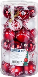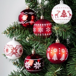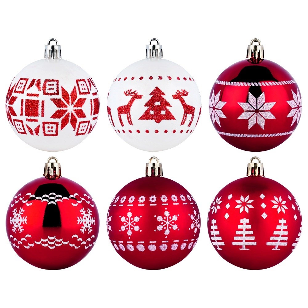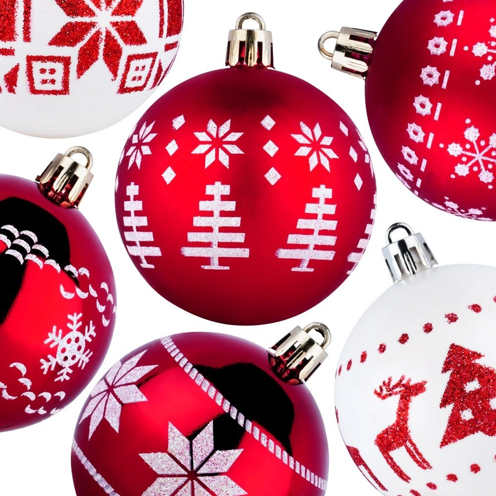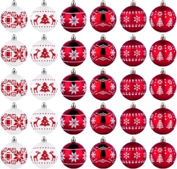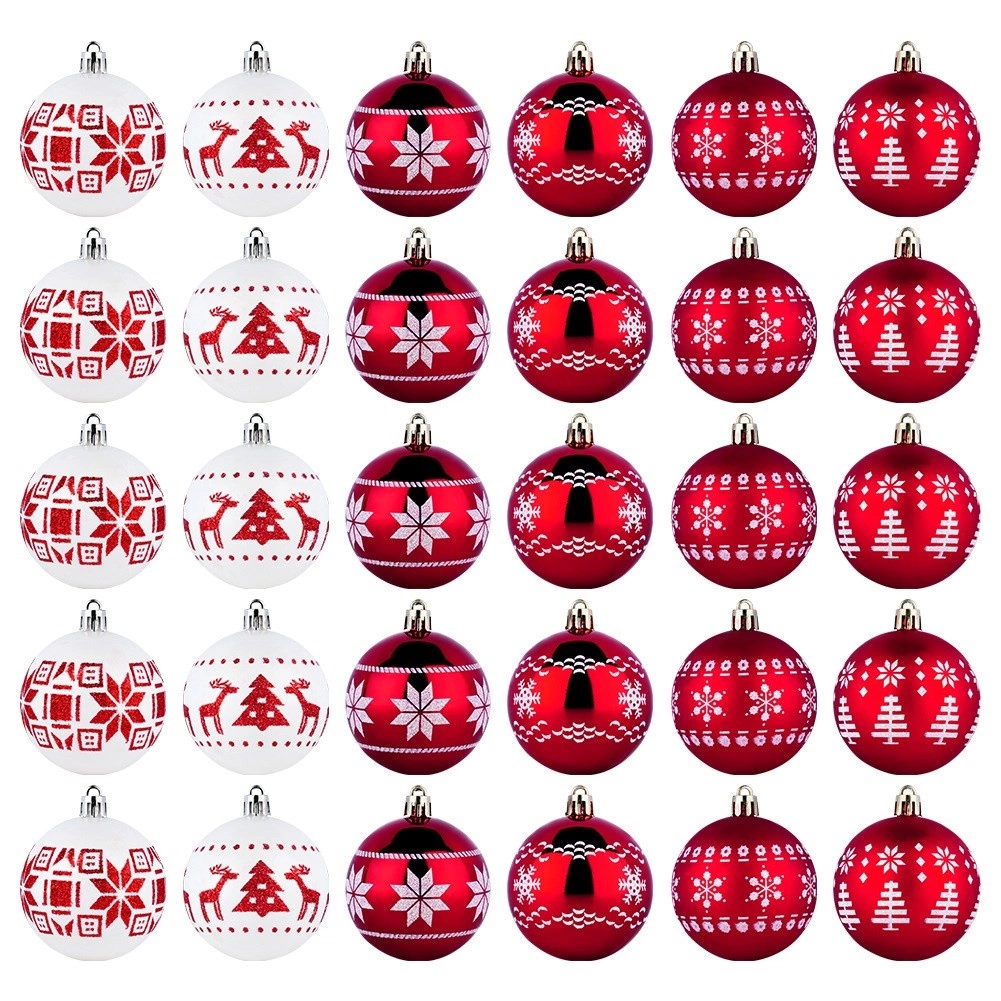 Crea en casa un ambiente festivo mágico con un juego de 30 adornos navideños irrompibles de 6 cm de diámetro en rojo y blanco. La combinación de bolas brillantes y mate con motivos elegantes aporta un toque clásico al árbol, y su diseño seguro de plástico resistente es ideal para hogares con niños y mascotas. También se incluyen cordones para colgar.