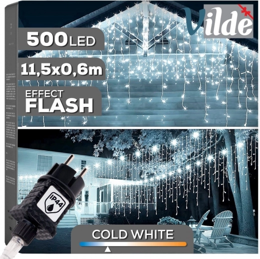 Esta estilosa cortina de luces con 500 LED de bajo consumo creará una deslumbrante decoración festiva en la fachada, la pérgola o en interiores. Los conductores transparentes y las diferentes longitudes de las ramas colgantes (35, 40, 45 y 60 cm) generan un efecto realista de carámbanos brillantes; algunos diodos parpadean suavemente para un aspecto aún más llamativo.