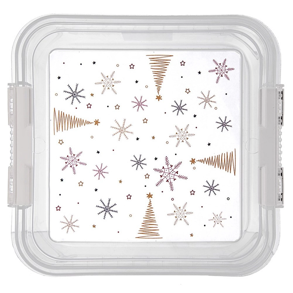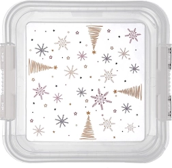 Caja práctica y resistente para el uso diario en la cocina y el hogar. Las paredes transparentes permiten comprobar el contenido al instante sin abrir, mientras que la tapa con clips seguros mantiene todo fresco y protegido. El estampado festivo de estrellas y arbolitos es especialmente agradable en época navideña.