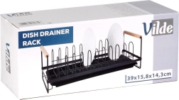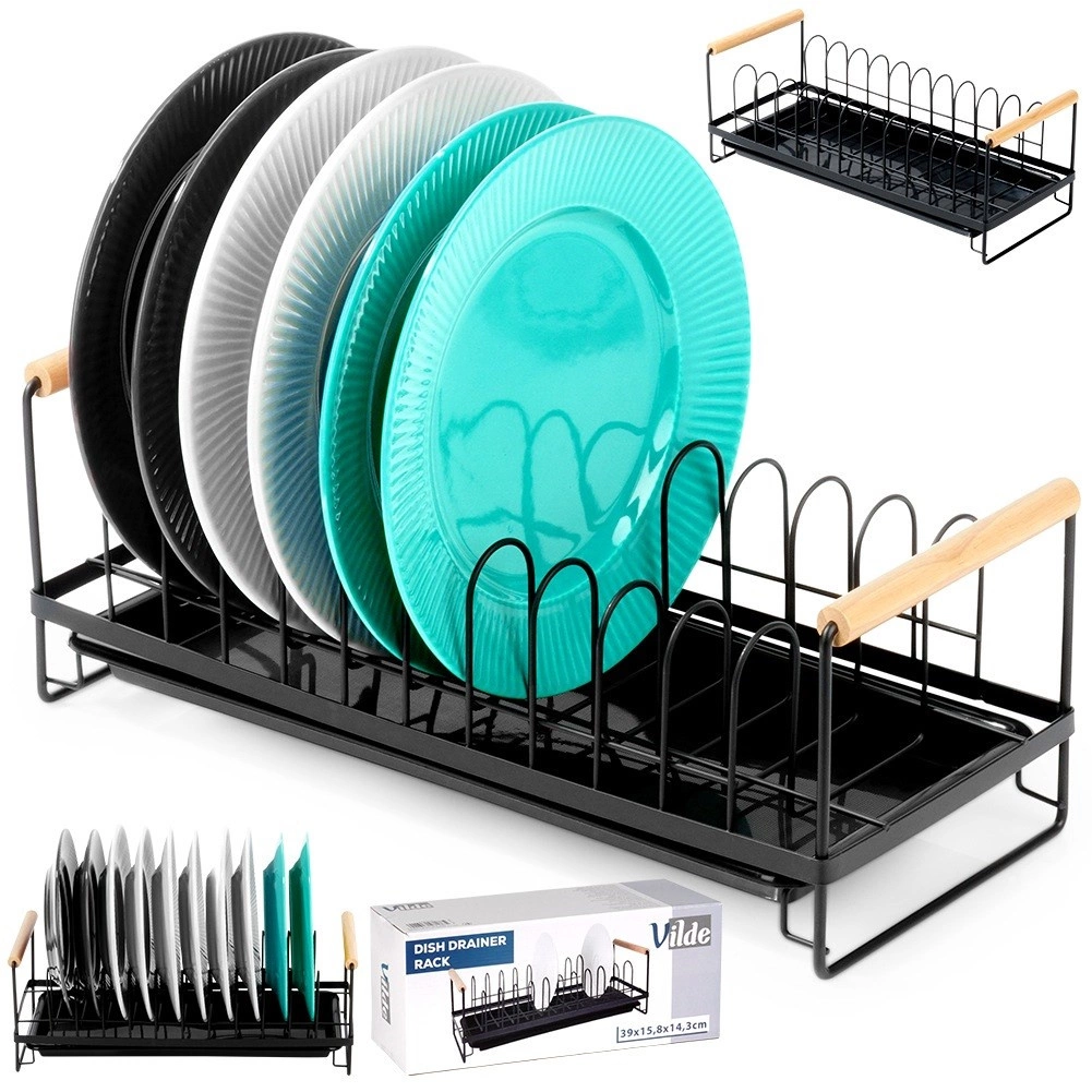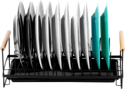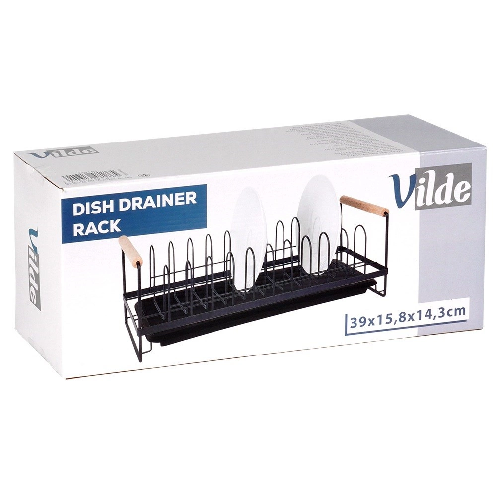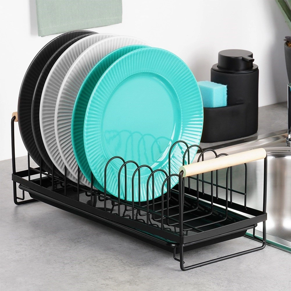 Escurridor de platos elegante y funcional que seca los platos de forma eficiente y a la vez protege la encimera de la humedad. Gracias a sus dimensiones compactas de 39 × 16 × 14,5 cm, cabe fácilmente junto al fregadero y garantiza el orden tras cada lavado.