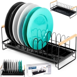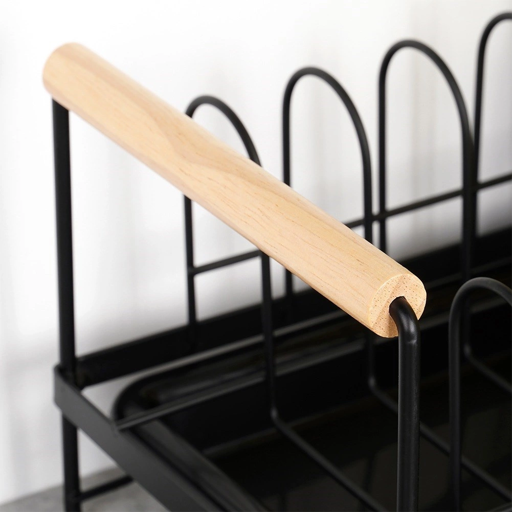 El robusto armazón metálico en color negro mate ofrece estabilidad y larga vida útil, mientras que la bandeja de goteo extraíble facilita la limpieza y mantiene secas las superficies de la cocina. Las asas de bambú facilitan la manipulación y aportan un toque natural al producto.