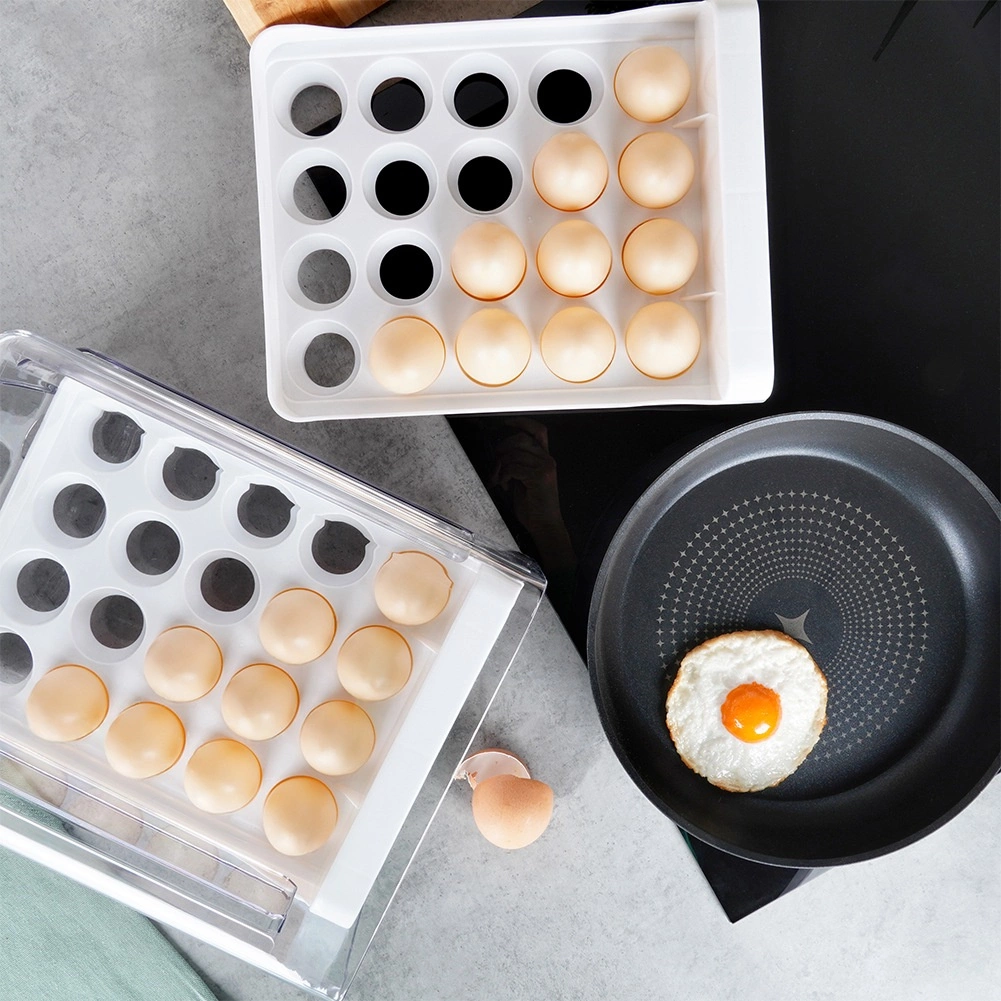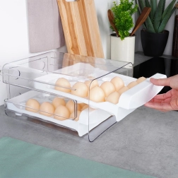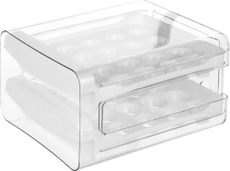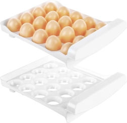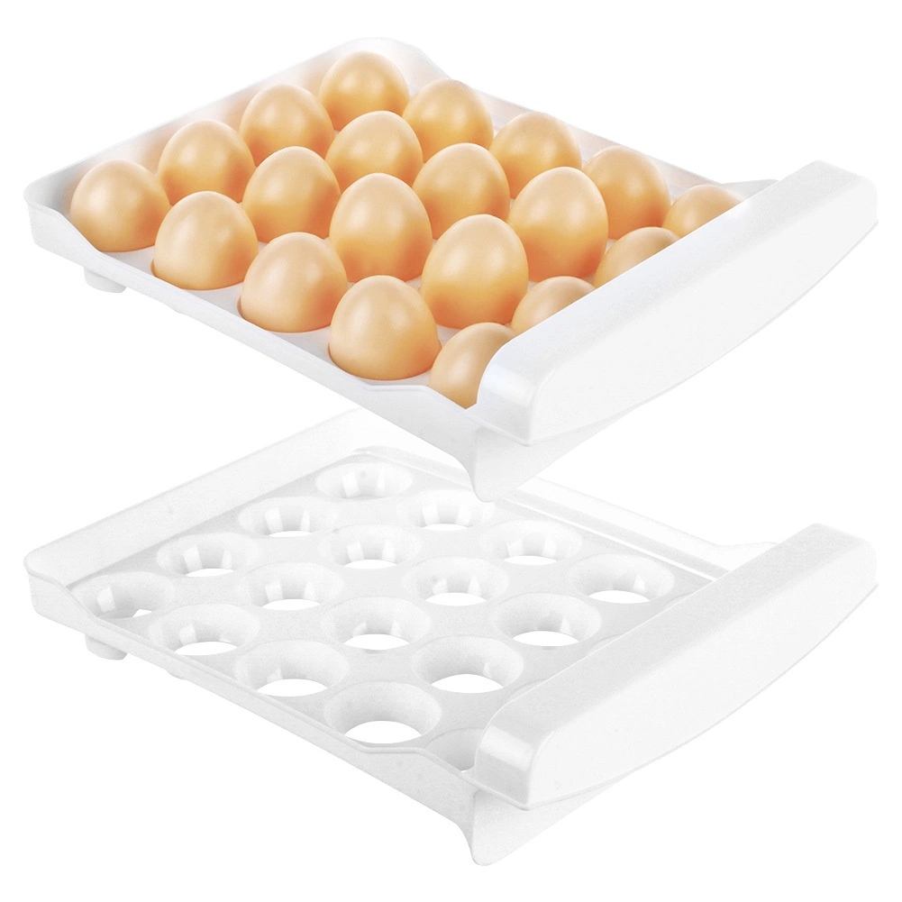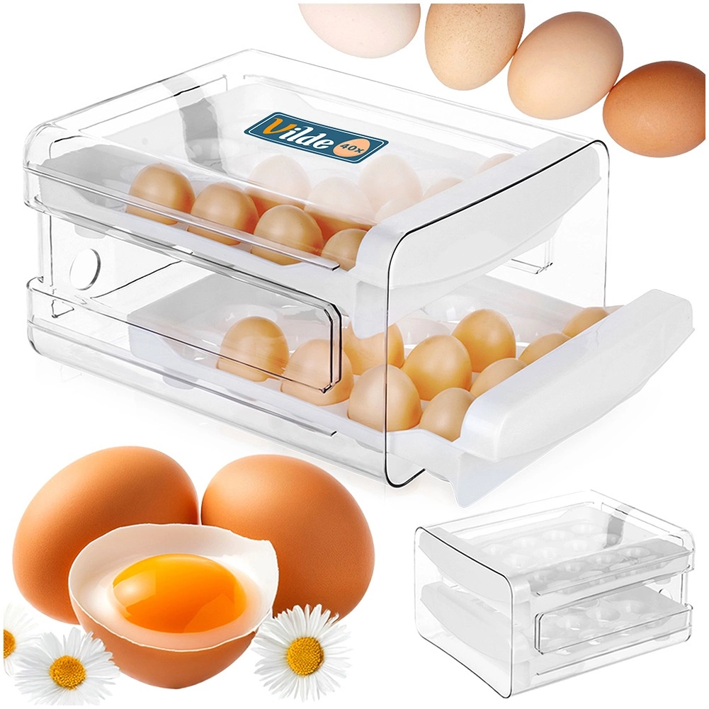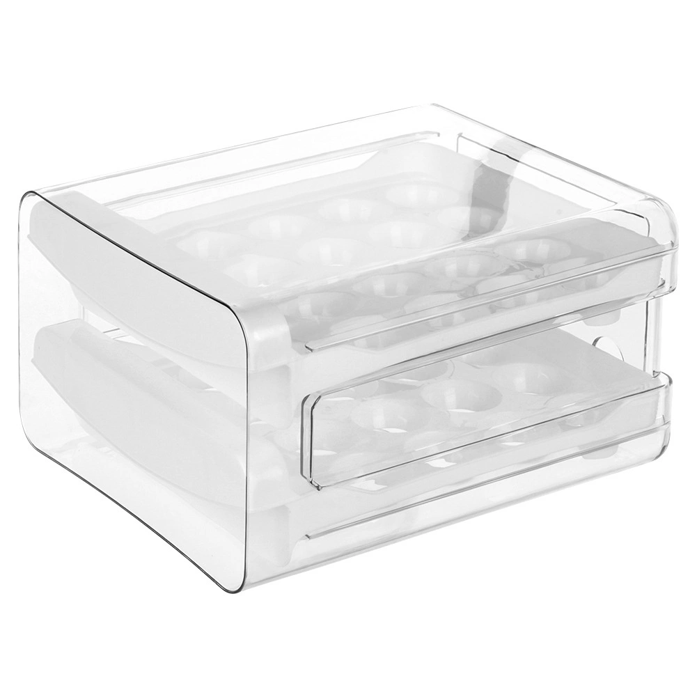 Práctico organizador de huevos de dos niveles con capacidad para 40 huevos que los mantiene ordenados, protegidos contra daños y siempre a mano. Gracias a los cajones deslizantes, sacar y rellenar es fácil; las paredes transparentes permiten un control inmediato de las existencias y sus dimensiones compactas ahorran espacio en el frigorífico.