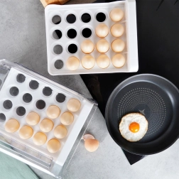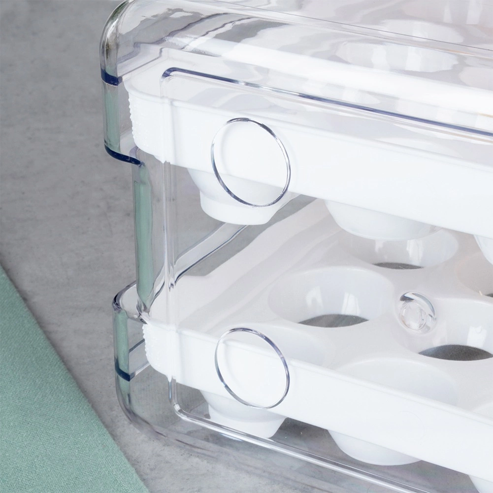 Mantenga el orden en el frigorífico con el organizador de huevos de dos niveles y capacidad para 40 unidades (20 por nivel). La tapa transparente y las bandejas blancas con cavidades especiales garantizan la estabilidad de los huevos sin que rueden. Gracias a su diseño inteligente, los huevos están mejor protegidos contra daños y se mantienen frescos durante más tiempo.