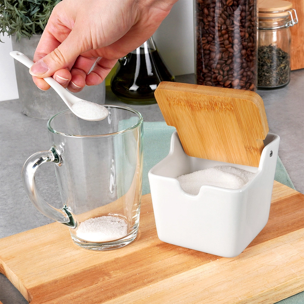 Elegante azucarero blanco de 250 ml con práctica tapa de bambú e hendidura integrada para la cucharita, para un dosificado cómodo. Gracias a la combinación de cerámica de calidad y bambú natural, mantiene el contenido fresco por más tiempo y libre de impurezas. Ideal para el uso diario en la cocina y en cafeterías. Diseño minimalista, acceso fácil con una sola mano y uso versátil para azúcar, sal y especias.
