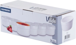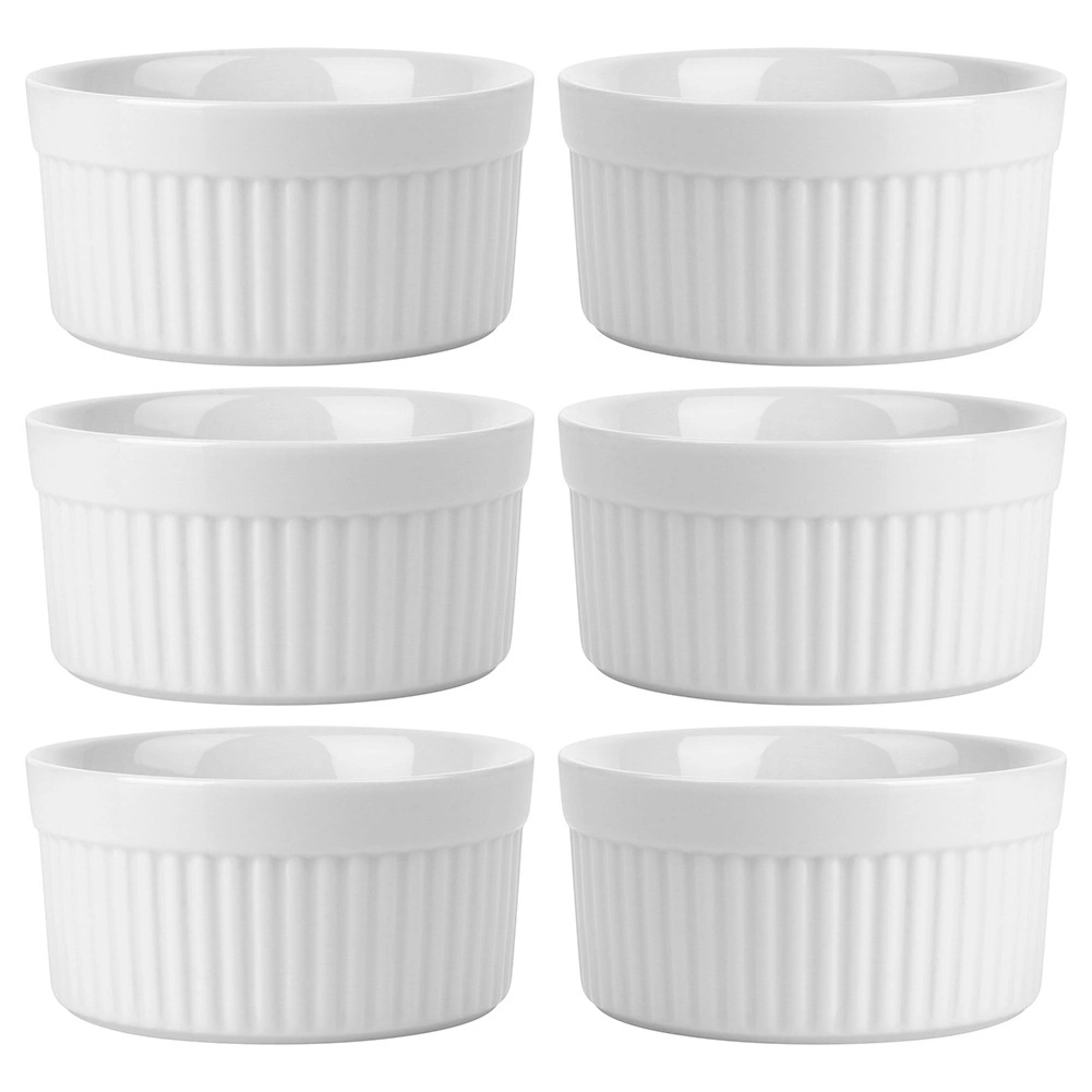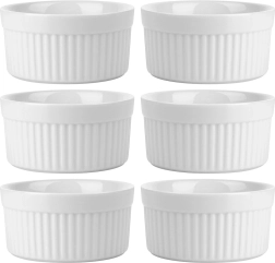 Práctico juego de seis cuencos para hornear blancos con capacidad de 260 ml que ofrece una solución elegante para hornear y servir. Los cuencos de cerámica de alta calidad son resistentes al calor hasta 350 °C, aptos para horno, microondas y lavavajillas. Gracias a su diseño acanalado clásico y al esmalte liso, son perfectos para crème brûlée, suflés, porciones individuales gratinadas, salsas o aperitivos.