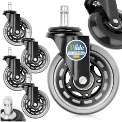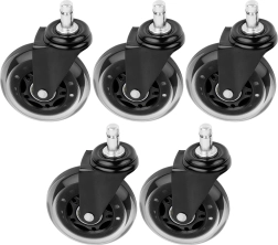 Mejora tu silla de oficina con ruedas de goma silenciosas y duraderas de 75 mm de diámetro con perno de 10 mm. El juego de 5 unidades garantiza un movimiento fluido y silencioso, protección del suelo contra arañazos y montaje rápido sin herramientas. Compatibles con muchas sillas de oficina, incluidos modelos seleccionados de IKEA con la misma medida de anclaje.