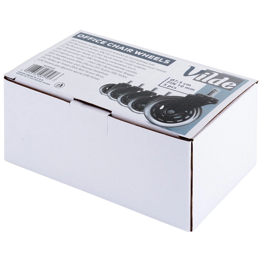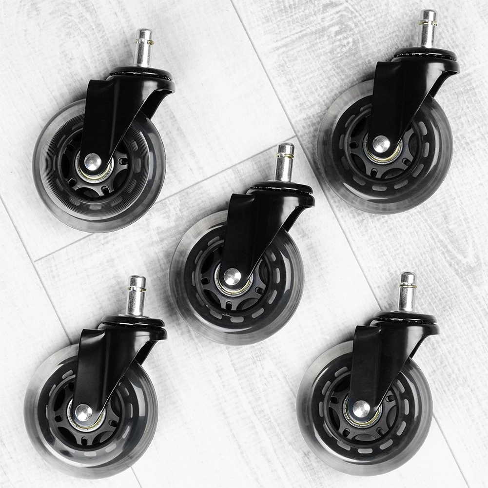 El juego de cinco ruedas de repuesto para sillas de oficina ofrece un desplazamiento cómodo y refinado en suelos duros. Las ruedas de goma resistente amortiguan el ruido, cuidan las superficies y, gracias a los rodamientos de calidad, garantizan un giro suave incluso con uso prolongado.