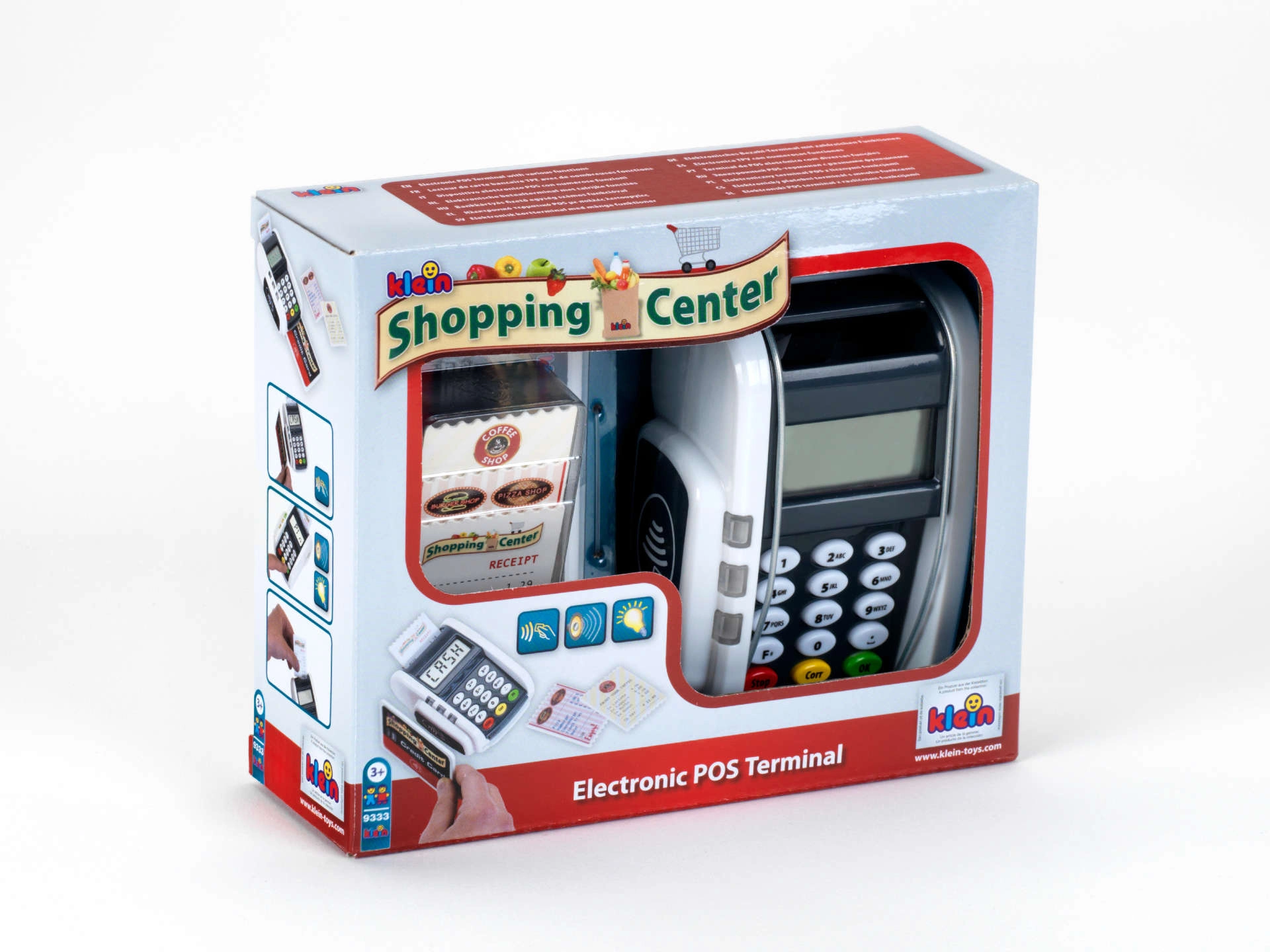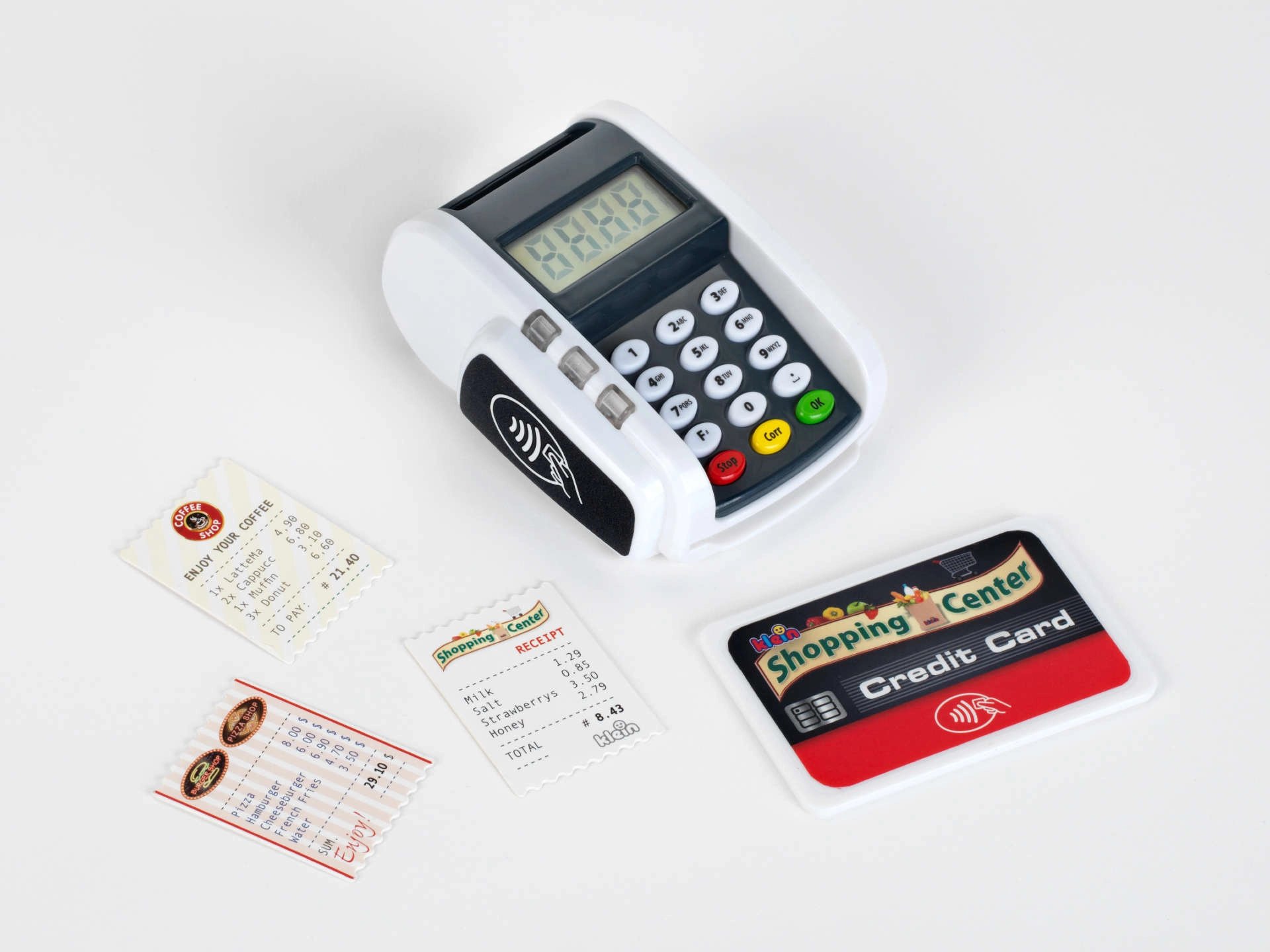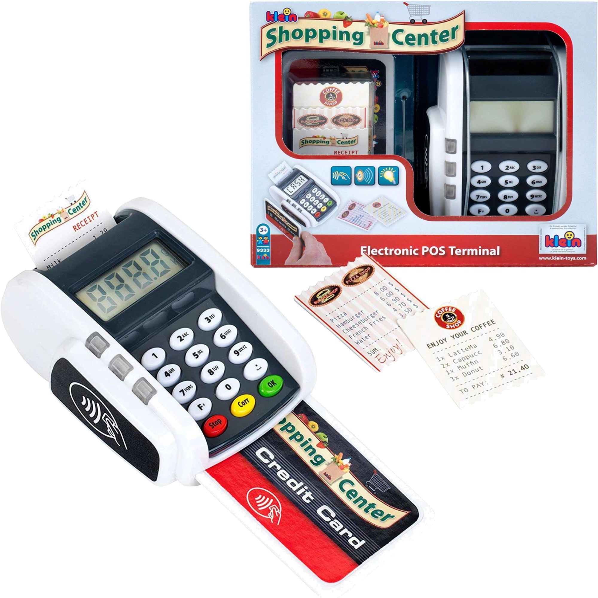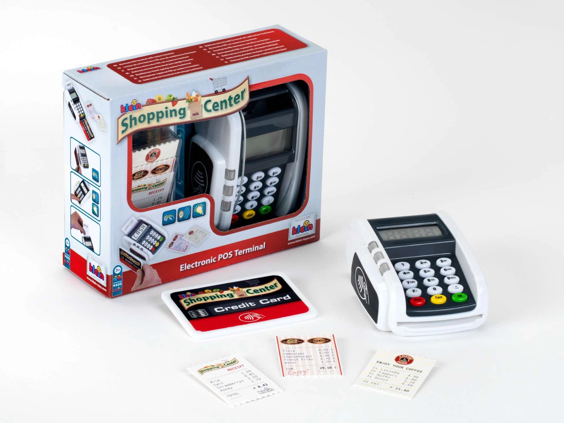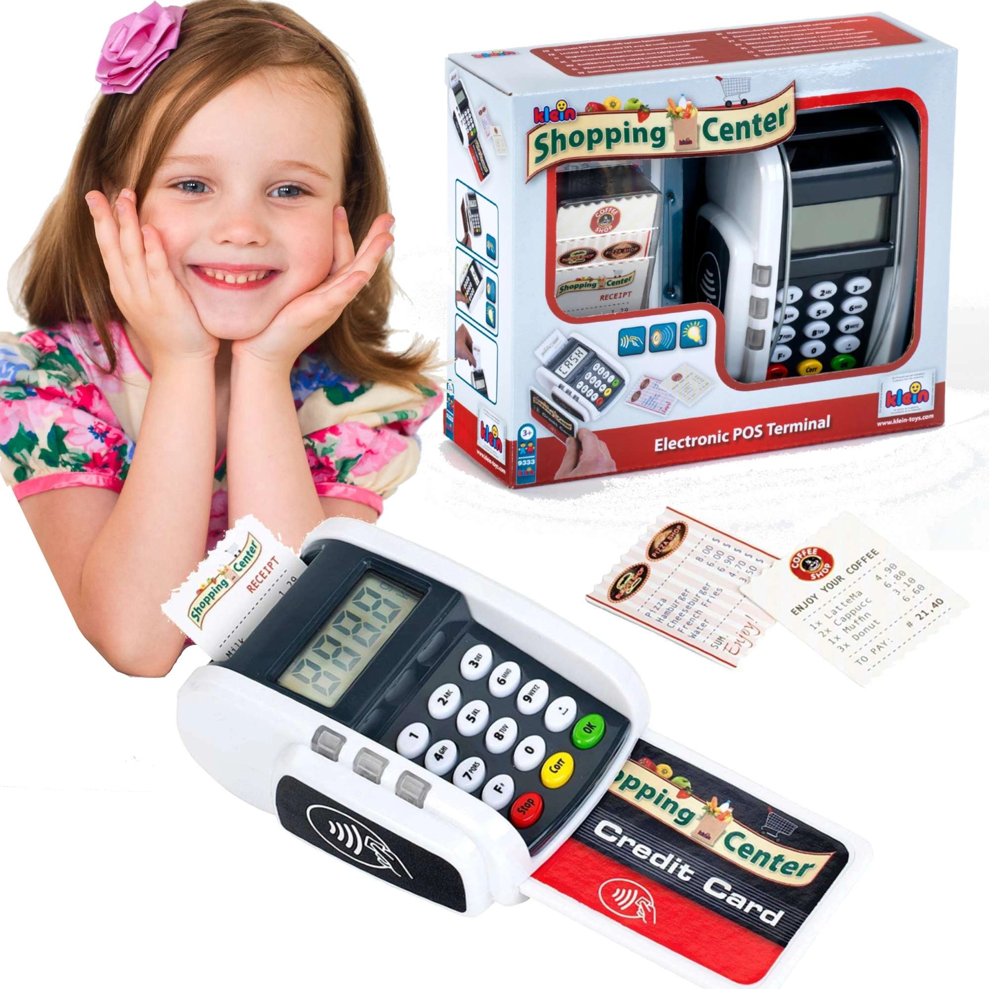 El terminal de pago infantil realista de la marca KLEIN aporta diversión como en la caja registradora. Ofrece botones funcionales, lector para pagos sin contacto, efectos de luz y sonido y permite a los niños desarrollar la imaginación de forma lúdica jugando a la tienda o al restaurante.