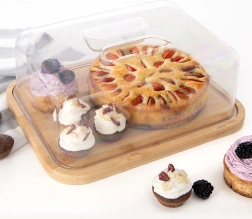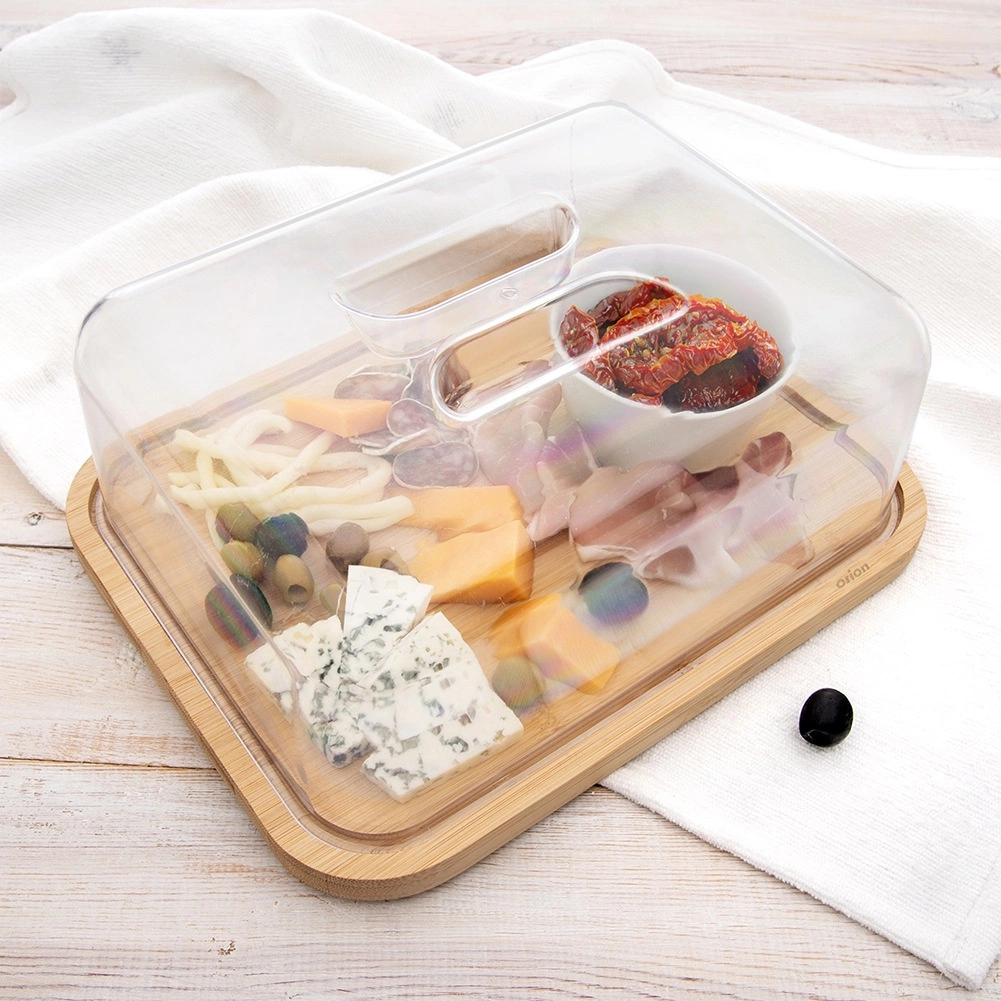 Esta tabla rectangular de bambú con tapa transparente está diseñada para el servicio diario y el almacenamiento de alimentos. Sus dimensiones con tapa de 28 × 22 × 11 cm ofrecen espacio suficiente para quesos, bocadillos, pasteles o fruta. La tapa transparente con asa integrada permite un acceso rápido y al mismo tiempo mantiene la frescura de los manjares servidos.