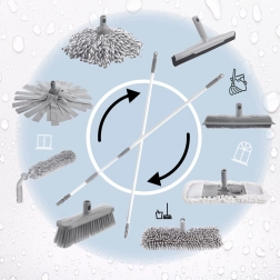 Gracias al material resistente a la humedad, la escoba se mantiene fácilmente: basta con enjuagar con agua. La cabeza forma parte de un sistema de accesorios intercambiables y permite un acoplamiento rápido a varillas compatibles, para que siempre tengas la herramienta adecuada para distintas superficies.