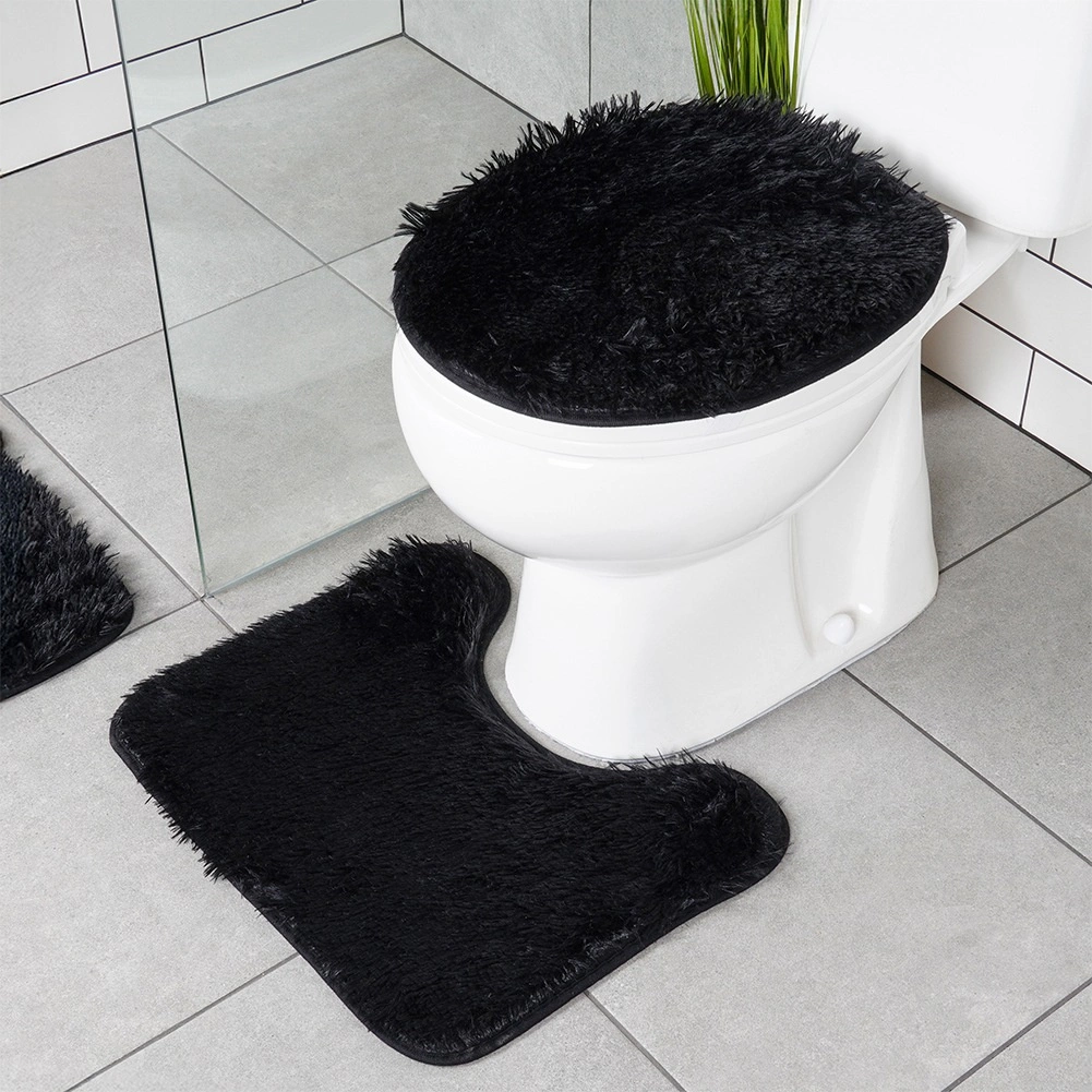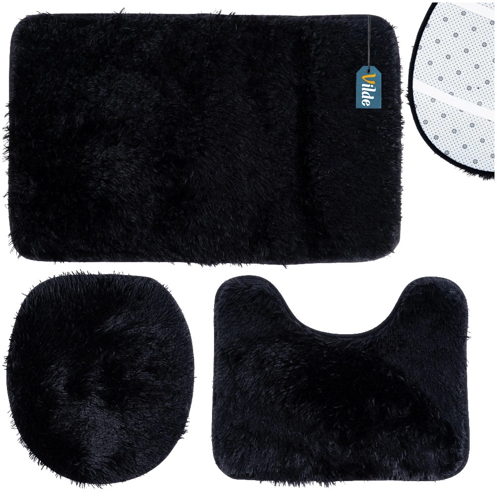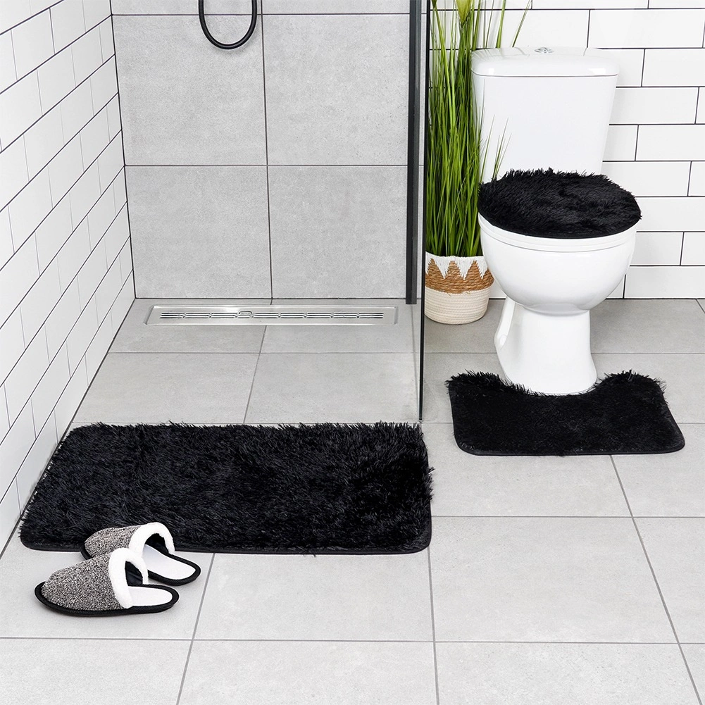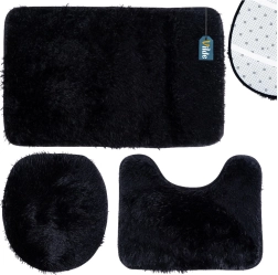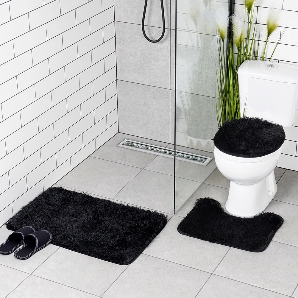 El set incluye una alfombrilla rectangular para la bañera o la ducha, una alfombrilla con recorte en U para la base del WC que mantiene limpio y cómodo el espacio alrededor del inodoro, y una funda para la tapa del inodoro con gomas elásticas para una fijación firme. El color negro minimalista encaja en cualquier interior y realza el diseño del baño.
