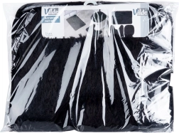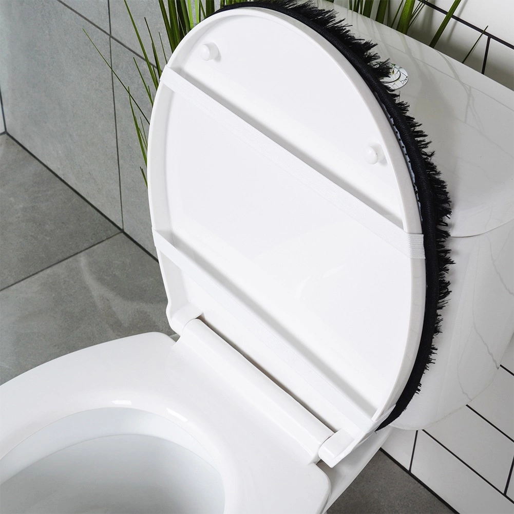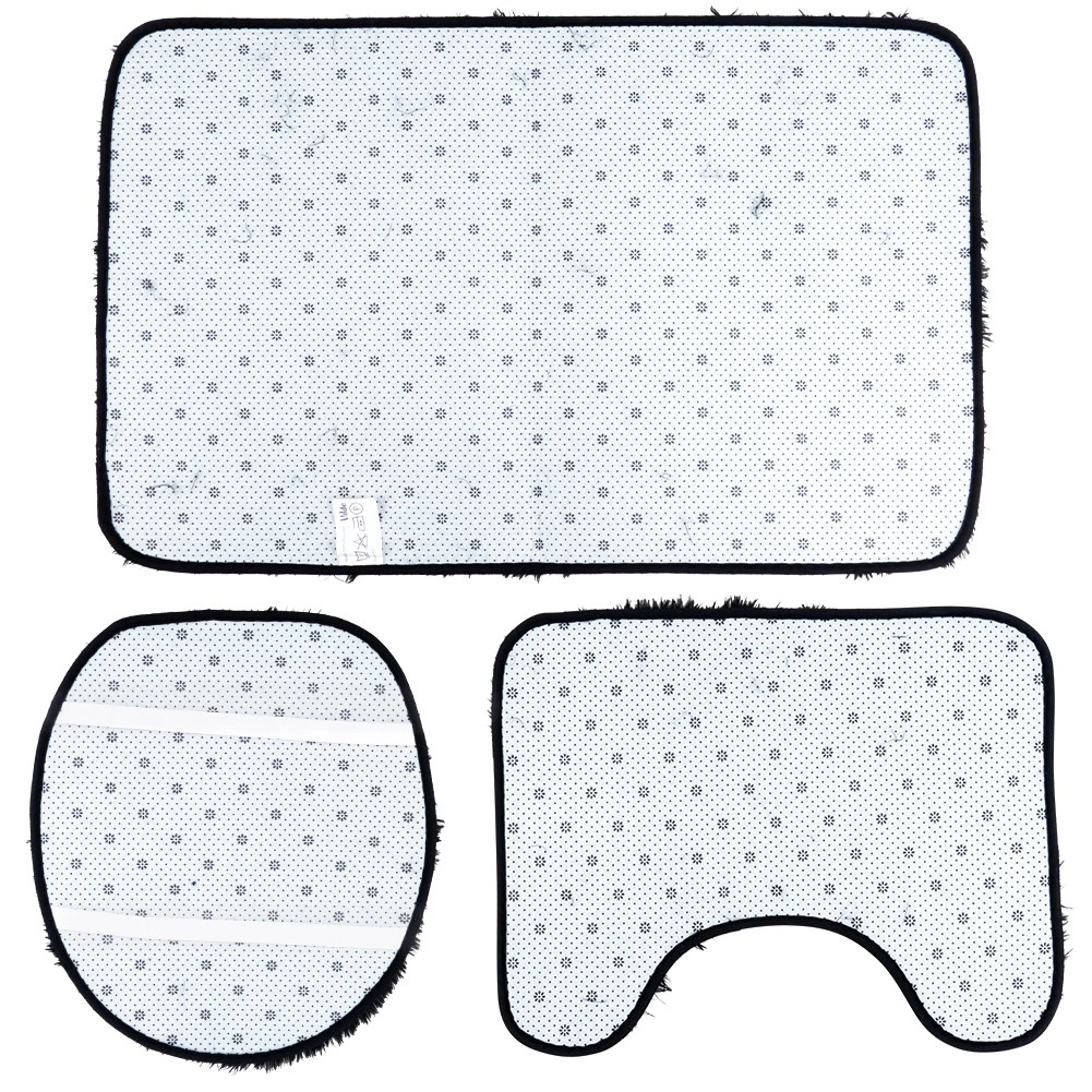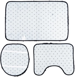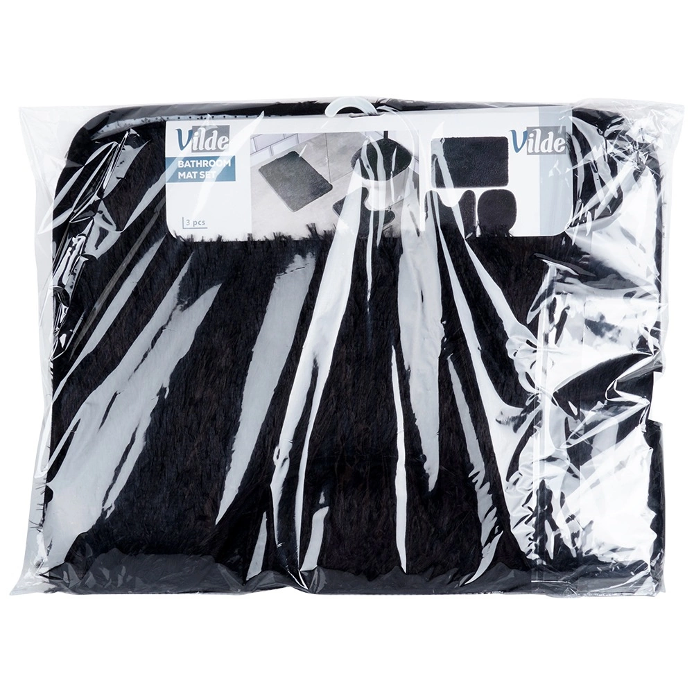 El set incluye una alfombrilla rectangular para la bañera o la ducha, una alfombrilla con recorte en U para la base del WC que mantiene limpio y cómodo el espacio alrededor del inodoro, y una funda para la tapa del inodoro con gomas elásticas para una fijación firme. El color negro minimalista encaja en cualquier interior y realza el diseño del baño.
