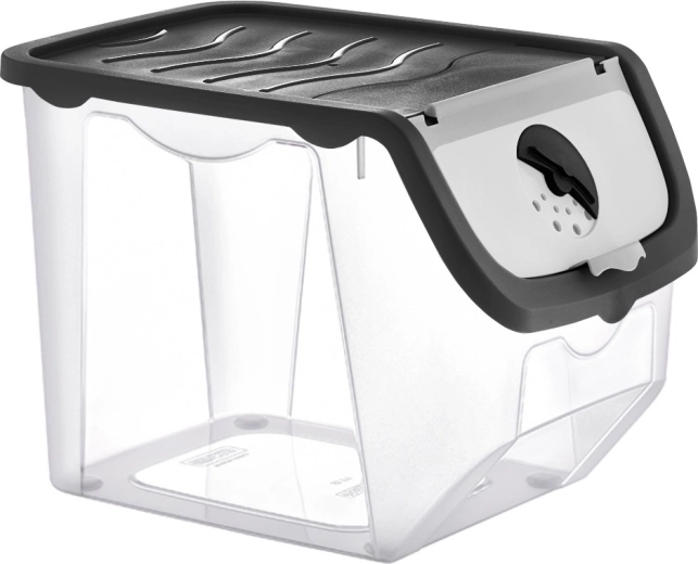 Práctica caja de almacenamiento de 12 l para la organización de alimentos en casa. Ideal para frutas y verduras, pero también para alimentos secos o comida para mascotas. Tiene paredes transparentes para un control fácil del contenido, tapa abatible con solapa para acceso rápido y ventilación regulable para una mayor frescura. Es resistente, apta para congelador (hasta -25 °C) y lavavajillas, y gracias a las almohadillas antideslizantes se mantiene estable en su lugar.