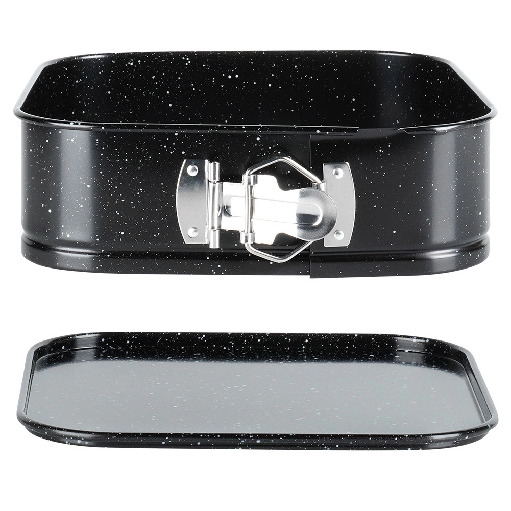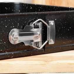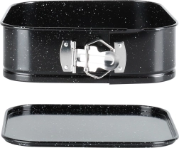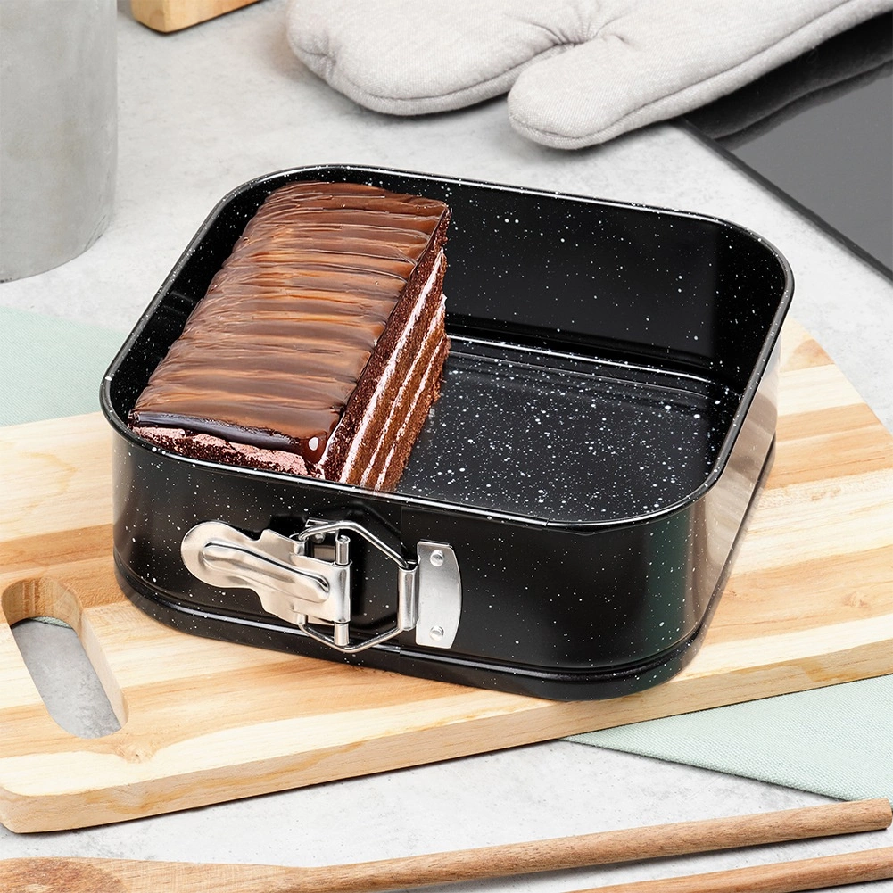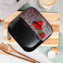 El molde cuadrado de 20 × 20 × 6,8 cm es una excelente elección para el horneado diario. El robusto acero al carbono garantiza la estabilidad y distribución uniforme del calor, mientras que la superficie granitada reduce la adherencia incluso usando poca grasa. Gracias al aro desmontable y a la base extraíble, podrás desmoldar el postre sin deformarlo.