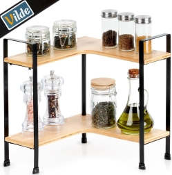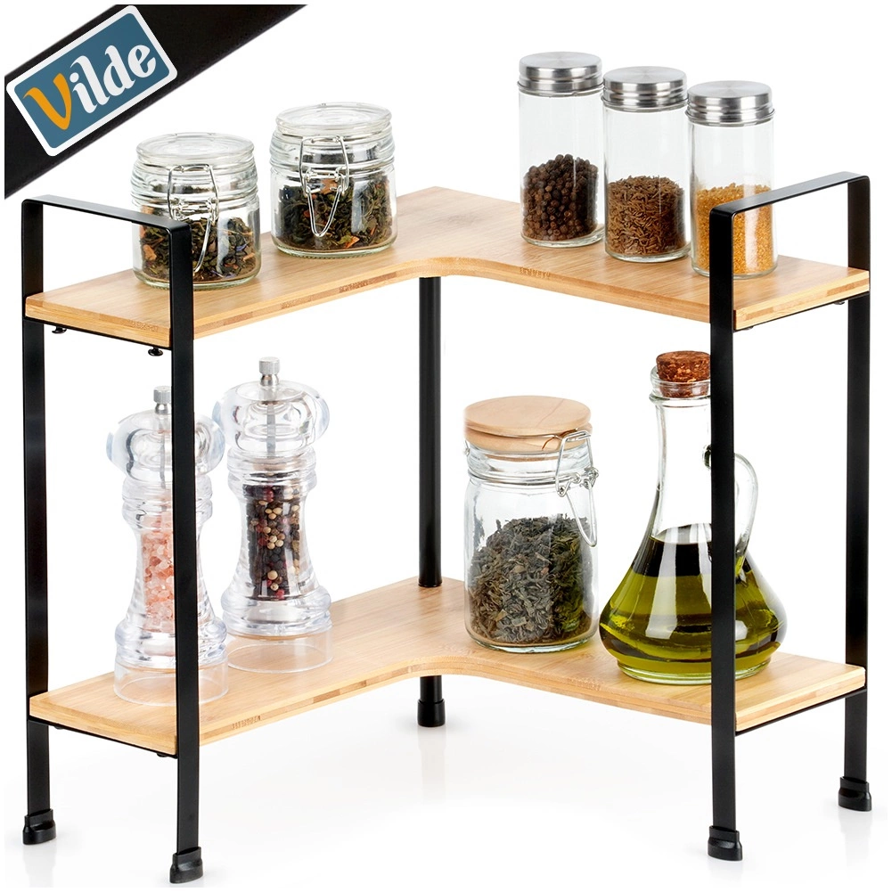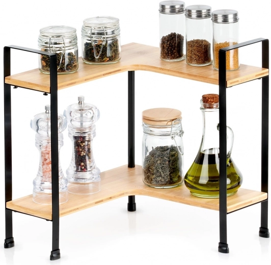 Mantén la cocina ordenada y con estilo con esta estantería esquinera de madera de bambú con estructura metálica resistente. Ofrece 2 niveles de almacenamiento, forma en L para esquinas y patas metálicas estables con protección de la superficie. Ideal para especieros, tazas, botes y cuencos, ahorra espacio en la encimera y encaja en interiores modernos.