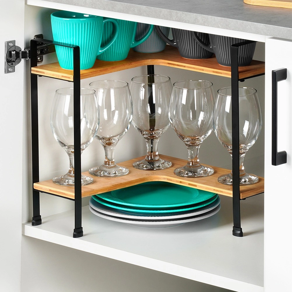 Esta elegante y práctica estantería esquinera ayuda a aprovechar al máximo el espacio en la encimera de la cocina y dentro de los armarios. Su diseño en L encaja a la perfección en la esquina, mientras que los dos niveles permiten organizar con claridad especias, vasos y pequeños accesorios. La combinación de bambú natural y metal negro aporta un aspecto moderno a la cocina.