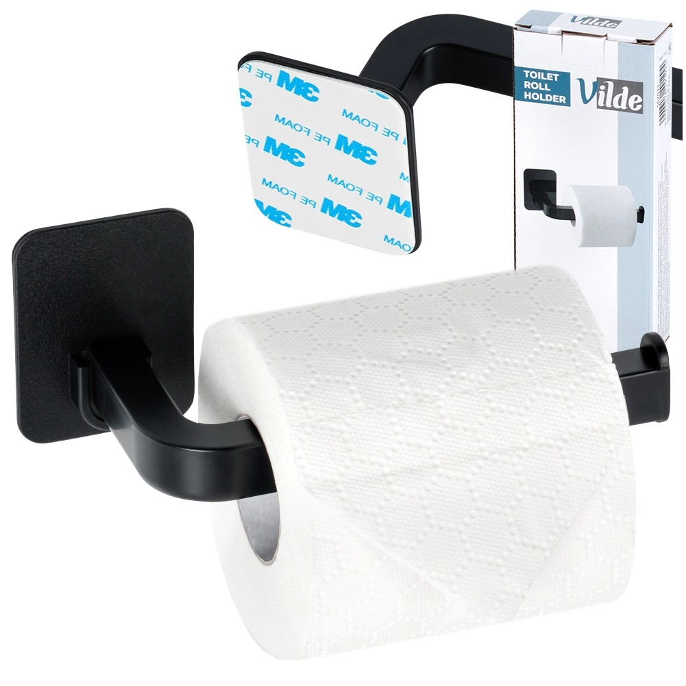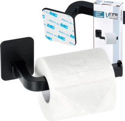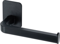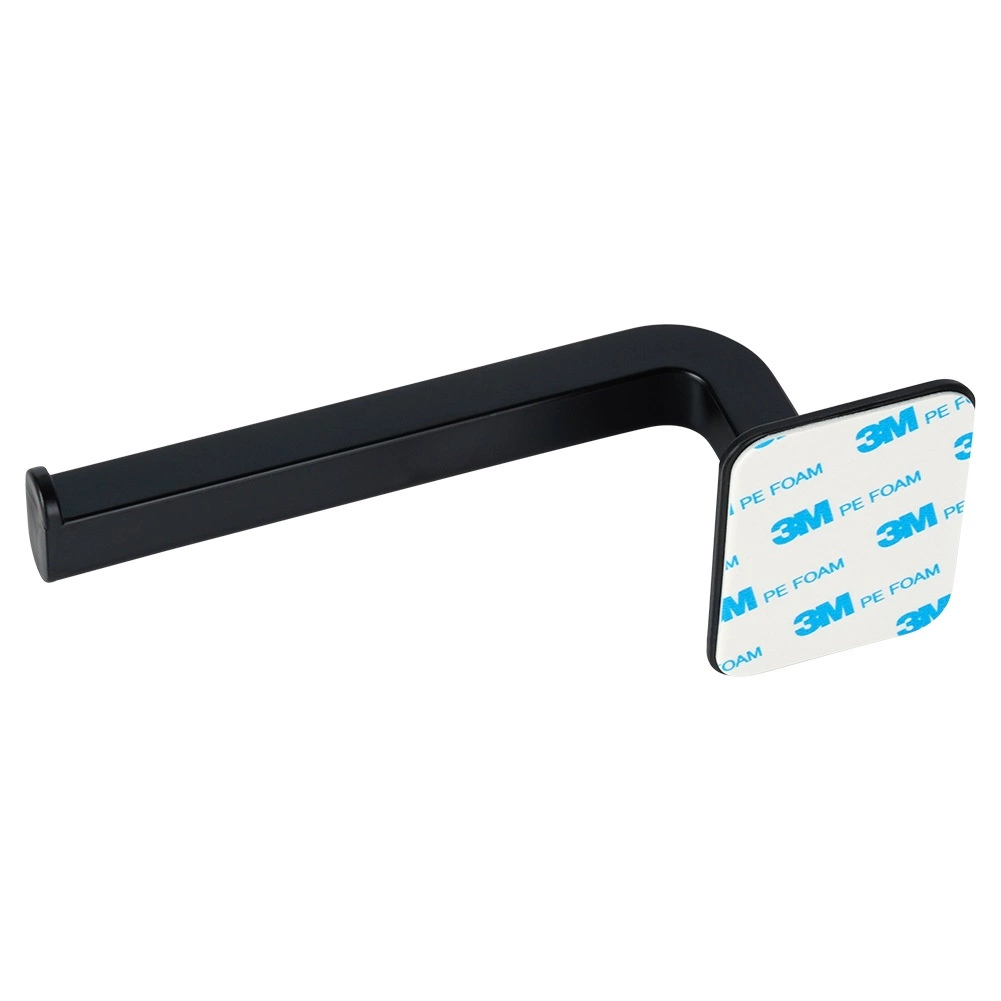 Elegante soporte para papel higiénico en color negro con montaje autoadhesivo 3M sin taladros. Dimensiones compactas 16,5 × 7 × 6,5 cm, diseño moderno y minimalista, cambio de rollo sencillo y fijación fiable en superficies lisas.