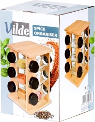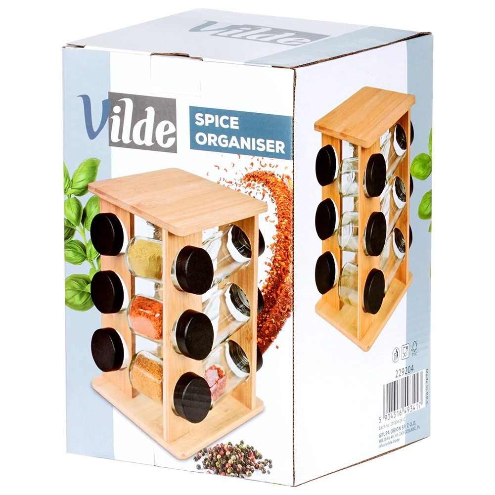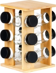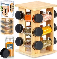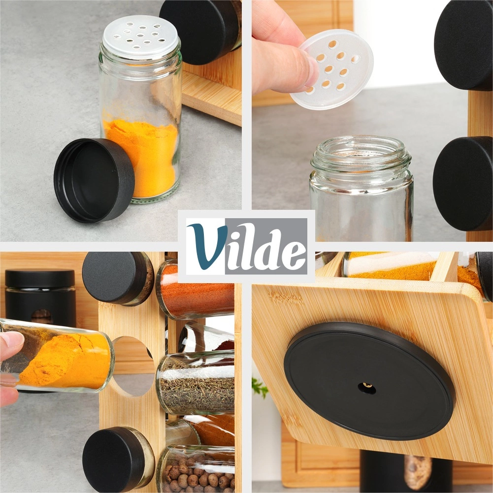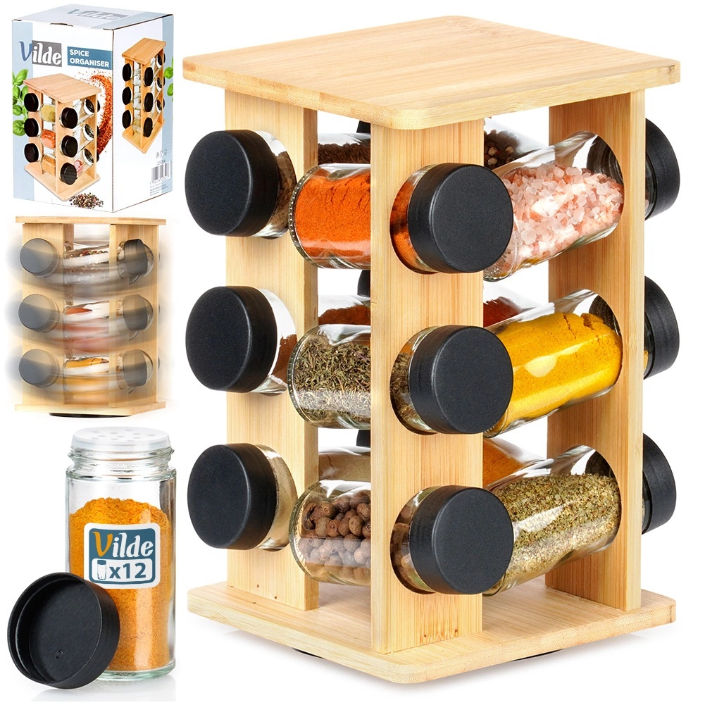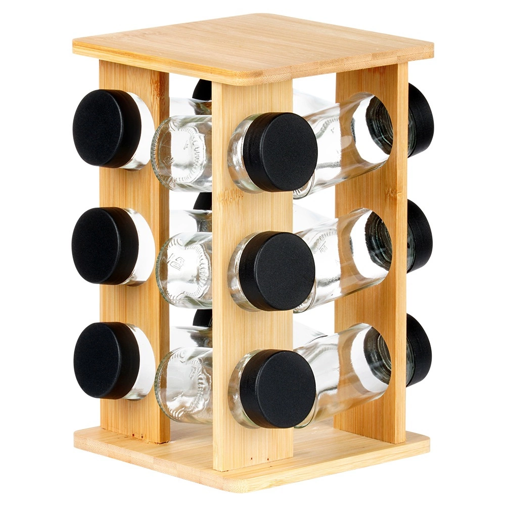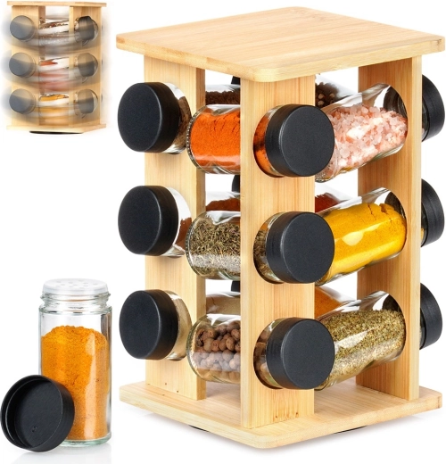 Mantén las especias a mano y perfectamente ordenadas. El soporte giratorio de madera de bambú natural aloja 12 tarros de vidrio para especias con tapas negras de rosca y rejillas blancas para un dosificado cómodo. Gracias al mecanismo giratorio encontrarás fácilmente el ingrediente que buscas, mientras que la estructura vertical compacta ahorra espacio tanto en la encimera como en el armario.