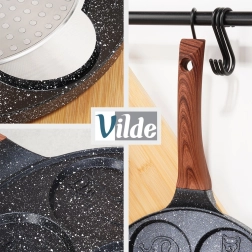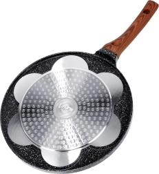 Práctica sartén de granito para huevos y tortitas con diámetro de 26 cm y 7 moldes de 8 cm de diámetro para una forma perfectamente redonda. El recubrimiento antiadherente permite cocinar con un mínimo de grasa, la distribución uniforme del calor ahorra tiempo y energía, y el mango Soft Touch garantiza un agarre cómodo y seguro. Apta para todo tipo de cocinas, incluida la inducción, y para lavavajillas.